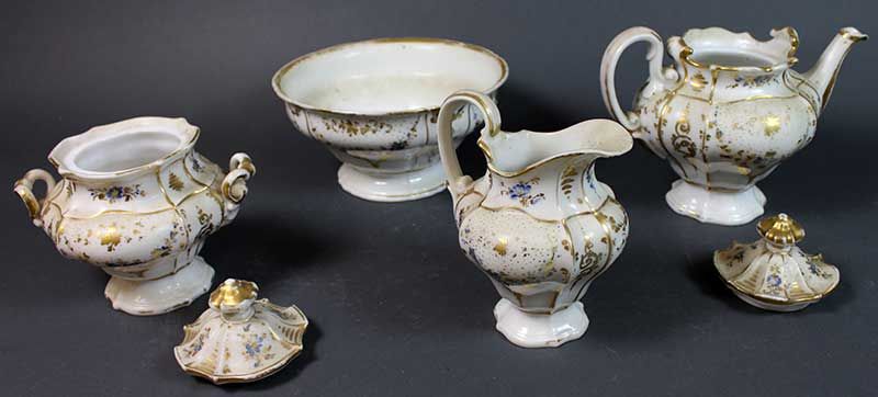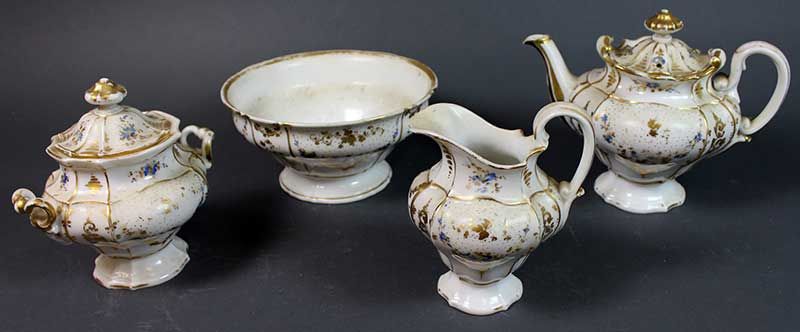 -comprised of hand painted and gilt highlighted tea post, covered sugar, creamer and center bowl.