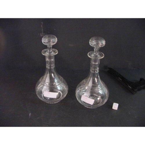 Hand blown and cut glass, bands of oval shapes designs, original stoppers with matching cuts, excellent condition, 9" tall by 4" wide, 1860-80. Unsigned, this is a pair.