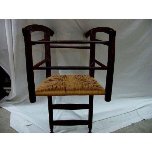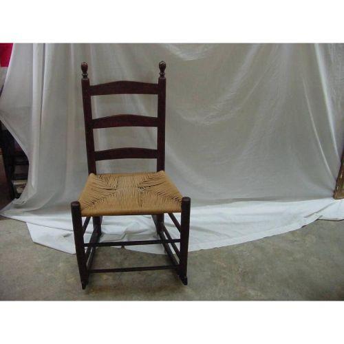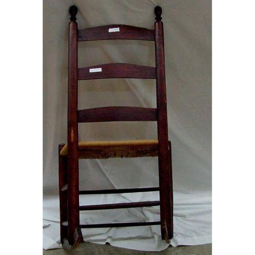 Circa 1870-1890, ladderback style with turned knob finials, good structural condition, replaced seat, old refinished surface to the Poplar wood, 36" tall, 19 1/2" wide by 14" deep.