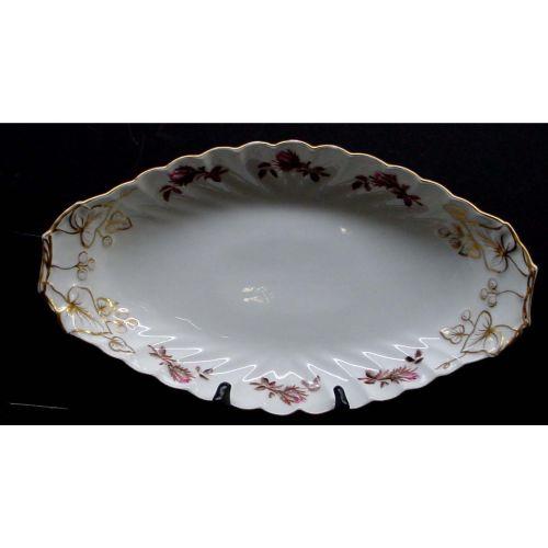 Unsigned, gold trim, look of old Haviland or similar style, leaves painted in gold with red floral sprays, 15 1/2" long, 9" wide by 2 1/2" tall, circa 1870-1890, nice piece of china.