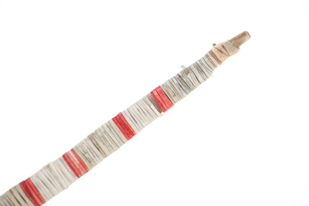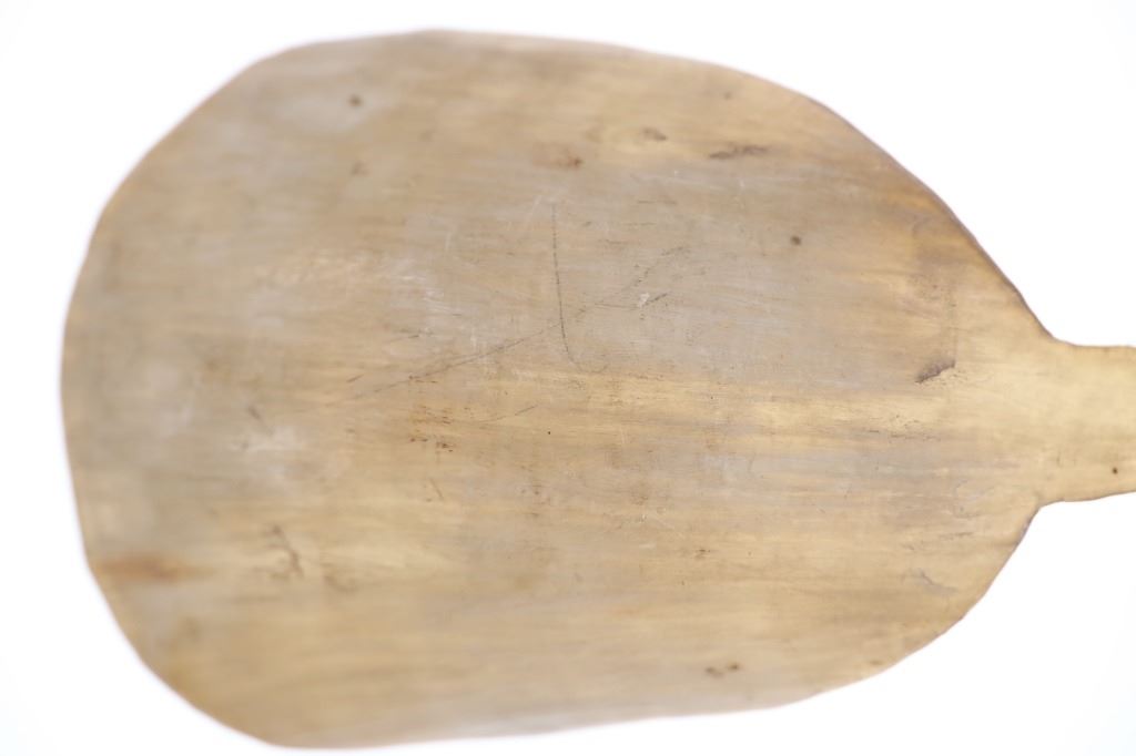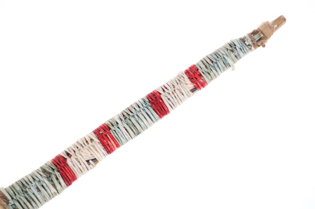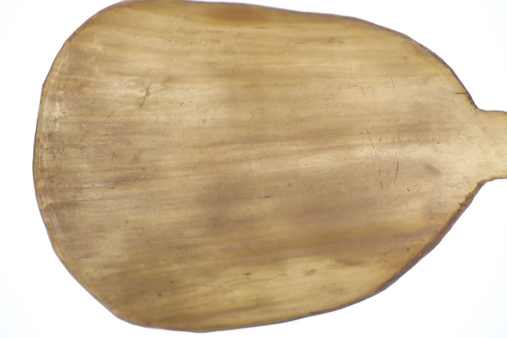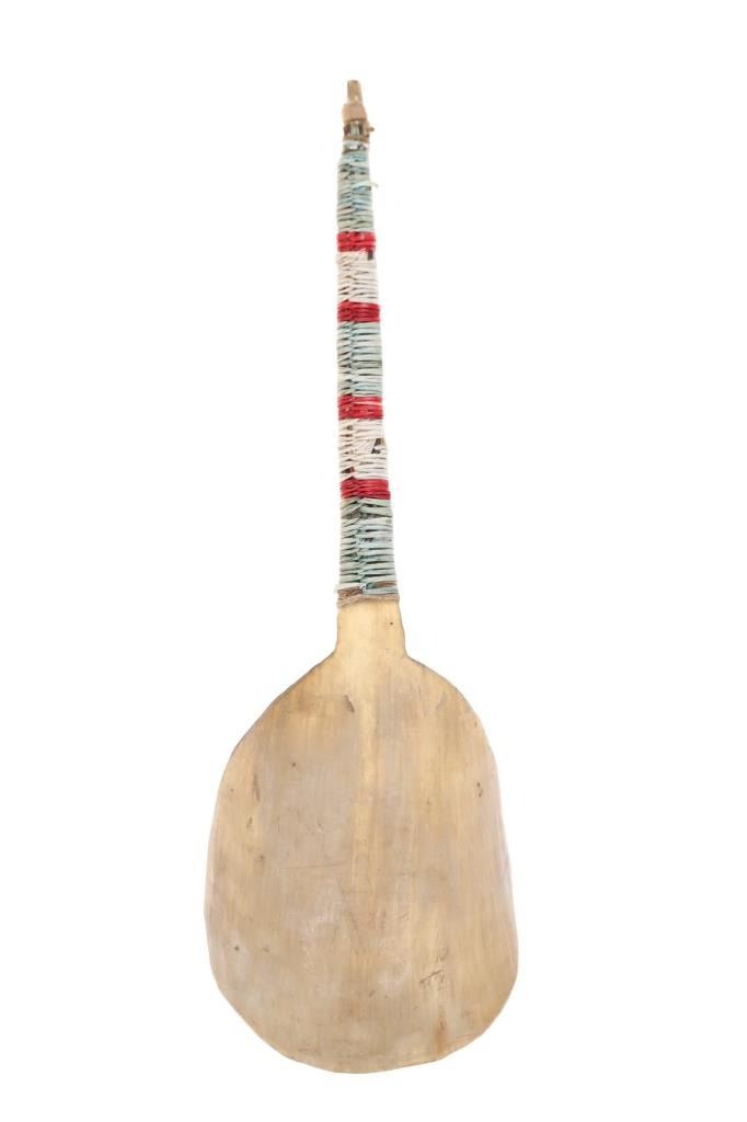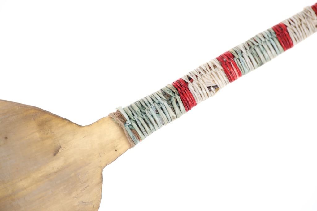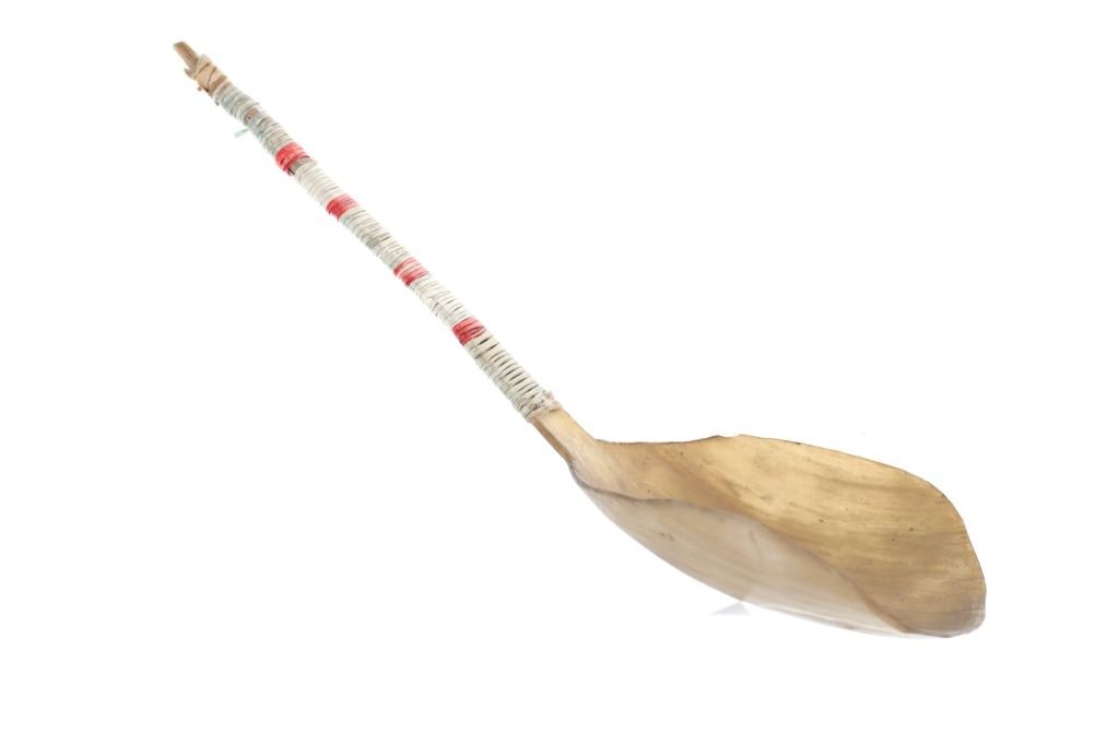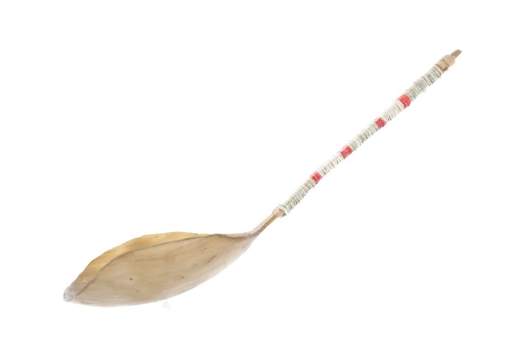 This is an excellent 19th-century Plains Quilled Horn Spoon from an ex-Hindman Sale and private Paris, France collection. The piece was found to be an authentic 1800’s Plains Horn Spoon by the experts at Hindman Auctions back in September 2021, noted as 19th century Plains Horn Spoon, with Bird Quill Wrappings. The piece shows a large carved horn spoon wrapped in porcupine quill quillwork with over Indian hide parfleche wrap with sinew sewing. This Indian Wars era piece displays beautifully and shows mineral colors of blue, red, and white quillwork. Provenance: From a private Paris, France collection and sold in Hindman’s September 2021 sale for around $550 (w/ bp). Measures overall 10 3/8-inches long by 3.25-inches wide.