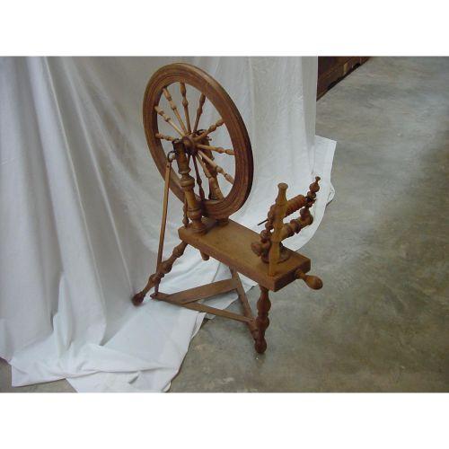 The most complete spinning wheel you ever saw, most if not all of the parts are there, intact, assembled, ready to begin work today. 39" tall by 32" deep, either Oak or Hickory, chip carving to the front, intact foot treadle, old refinished surface, this is a work of art to see all of the turnings and score lines. Circa 1850.