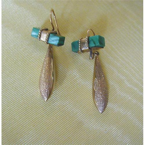 19TH CENTURY PAIR OF 14K YELLOW GOLD DETACHABLE EAR PENDANTS DESIGNED TO BE WORN WITH A GOLD AND MALACHITE BAR / This bar can be worn alone or with the hanging pendants. The pendants can be worn with the high polish side to the front or with the engraved design side to the front. ( see images of both sides of pendants.) These pendants are 1 1/4" long ... when attached to the bar the earrings hang approx. 2" long. These are lovely Victorian earrings.