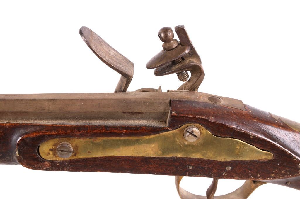 For your consideration is a Flintlock African trade musket chambered in .65 caliber. This flintlock musket is typical of thousands produced in England during the 18th and 19th centuries for export throughout the British Empire. The Royal African Company, established in the late 17th century, supplied muskets in payment for slaves. Later, the African Company of Merchants continued this trade and by 1775 the price for a slave had risen to at least two muskets. Manufacture of trade muskets continued long after the Abolition of Slavery in 1833, and some were still being produced well into the 20th century. The musket has a 51” round barrel with ram rod. The octagonal portion of the barrel is stamped with a Liege proof mark “ELG” dating the rifle to 1811-1892. The rifle shows a wonderful patina and operates as intended. The brass side plates, trigger guard and housing for the ramrod shows a wonderful yellow coloring. No serial number. This firearm qualifies as an Antique, and does not require FFL Transfer or NICS Background Check. Matt