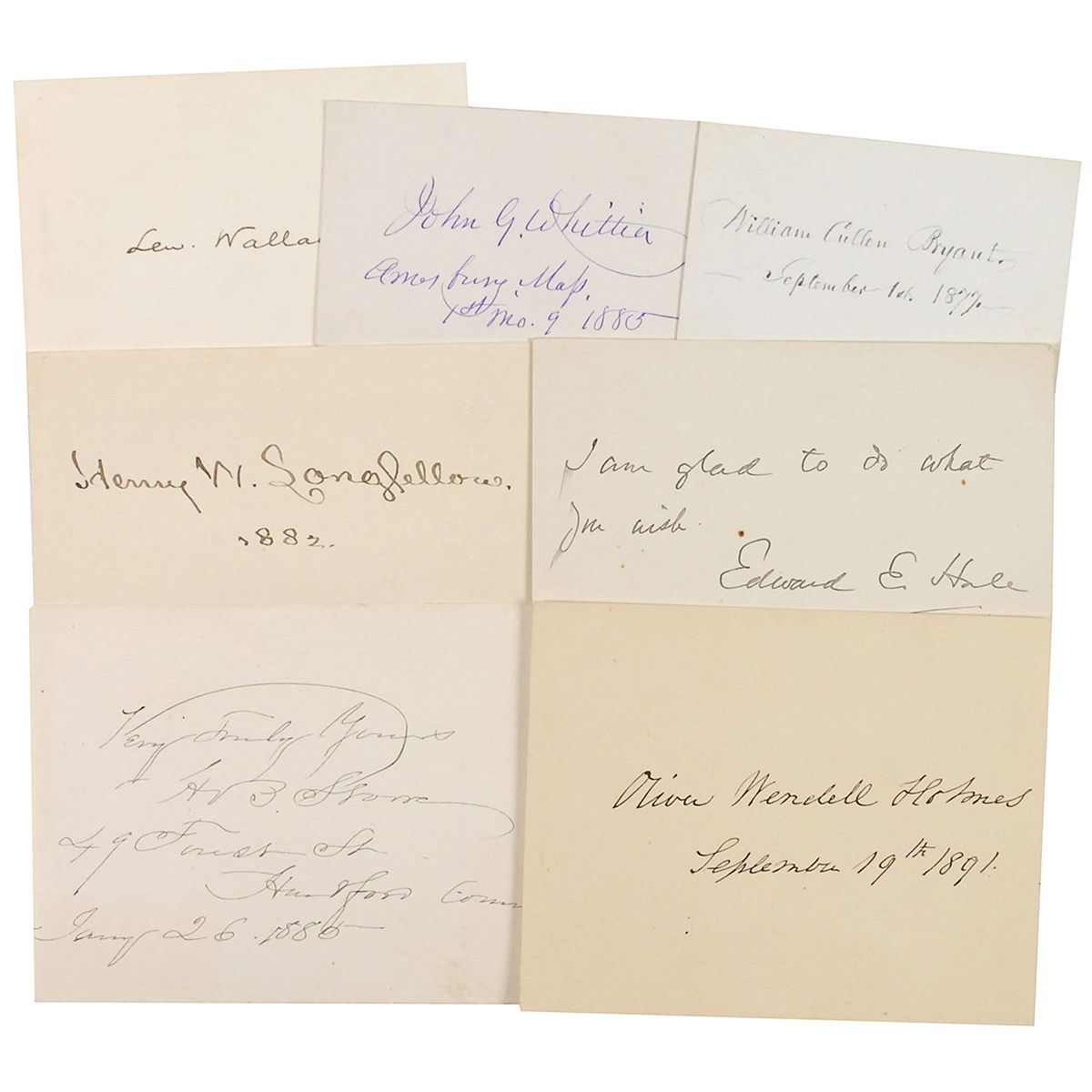 Choice selection of seven vintage ink signatures of prominent 19th century American authors on cards and sheets of various sizes. Signers are: Harriet Beecher Stowe, Henry W. Longfellow, Oliver Wendell Holmes, Lew Wallace, John Greenleaf Whittier, William Cullen Bryant, and Edward Everett Hale. In overall fine condition.