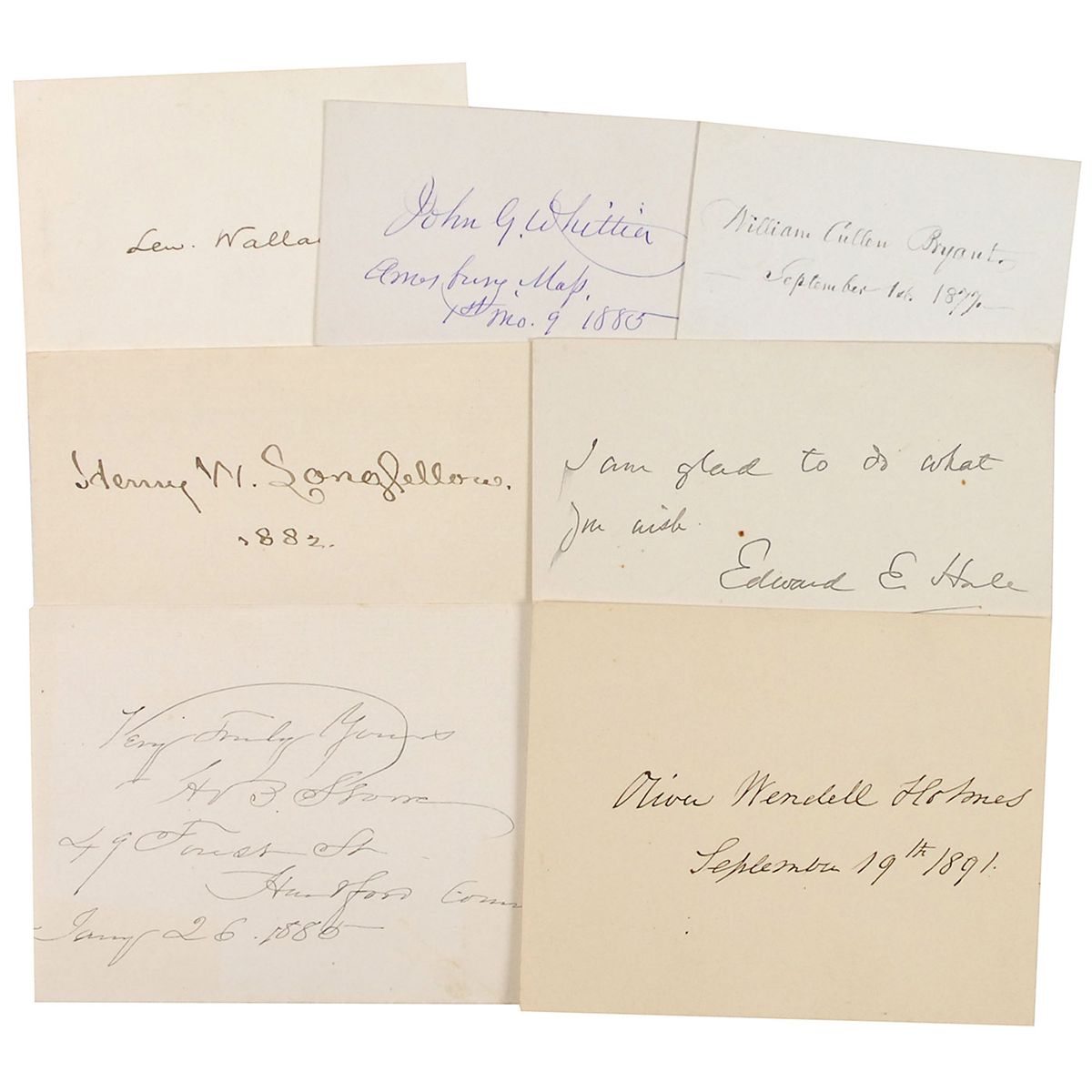 Choice selection of seven vintage ink signatures of prominent 19th century American authors on cards and sheets of various sizes. Signers are: Harriet Beecher Stowe, Henry W. Longfellow, Oliver Wendell Holmes, Lew Wallace, John Greenleaf Whittier, William Cullen Bryant, and Edward Everett Hale. In overall fine condition.