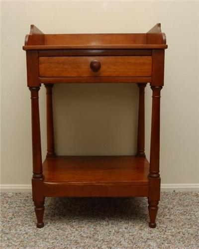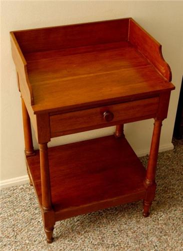 Early American cherry table with one drawer, blacksplash, and medial shelf. 32 1/2" by 20 3/4" by 17." Very good condition