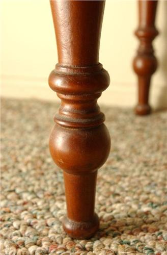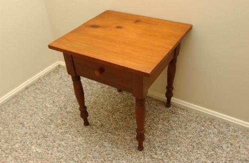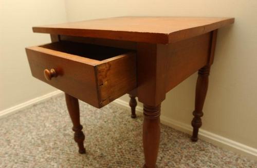 Early American solid cherry antique side table with nicely turned legs with single drawer, small scrape on top. 19 1/2" by 18" by 16 3/4"