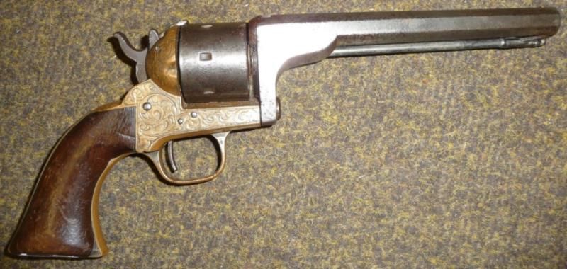 A 19th Century American Seven Shot Rimfire Revolver, with 15cm octagonal steel barrel, numbered 3388, under-lever rammer, plain cylinder, the bronze frame bearing traces of original plating, engraved with scrolling foliage, with two piece walnut grip