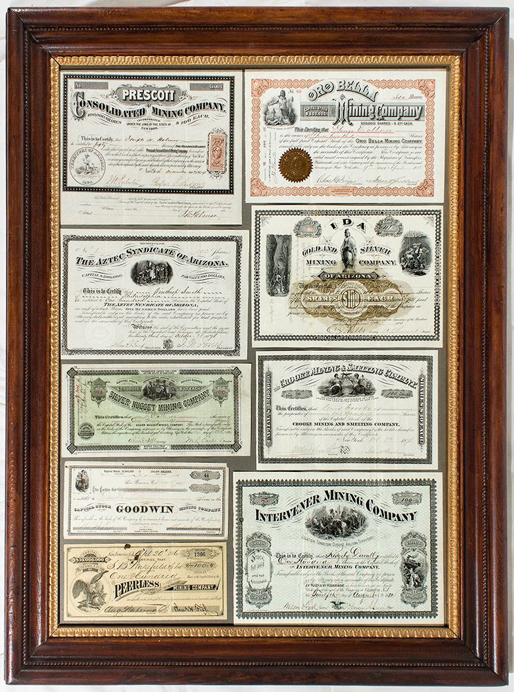 This lot features 9 fabulous mining stock certificates in a 36" x 27" frame! 1) Oro Bella Mining Co. stock number 80, issued to George Morse for 300 shares in 1888. 2) Ida Gold & Silver Mining Co., stock number 395 issued to Henry Hamilton for 41 shares in 1884. 3) The Crooke Mining & Smelting Co. issued to Lewis Crooke for 100 shares. It was signed by the first Arizona Territorial Governor John N. Goodwin as president. 4) Intervener Mining Co. stock number 85 issued to Ridgeby Duval Jr. for 100 shares in 1882. 5) Prescott Consolidated Mining Co. stock number 83 issued to Joseph Helmer for 50 shares in 1864. 6) The Aztec Syndicate of Arizona, stock number 1 issued to Winthrop Smith for 100 shares in 1878. 7) Silver Nugget Mining Co. Stock number 973 to a J. Nestham for 100 shares. 8) Goodwin Mining Co. Stock number 44 issued to Ward Masterson for 1,000 shares in 1877. 9) Peerless Mining Co. issued to S.B. Markfield for 100 shares in 1886. Bud Bassett Collection - HKA#65599