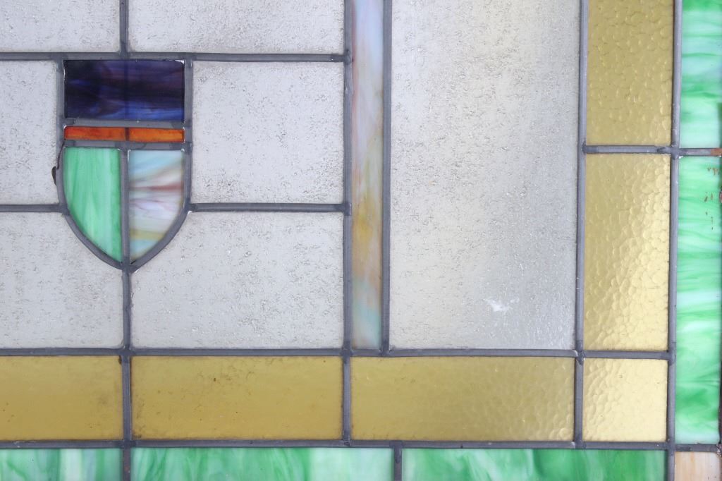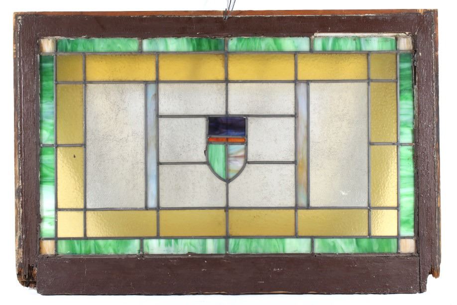 Offered in this lot we have a art deco style stained glass window originating from the late 19th century. The panes show good condition in colors of green, yellow, blue, red, and clear. The glass is arranged in a rectangular pattern with a shield pattern at the center. The glass panels are leaded at the creases. The glass is set into a brown wooden frame. The piece shows good condition overall with some rot damage on the frame. The piece measures 36" wide by 24" tall.