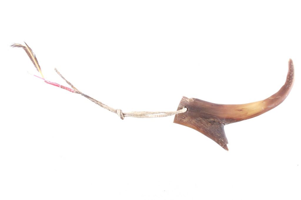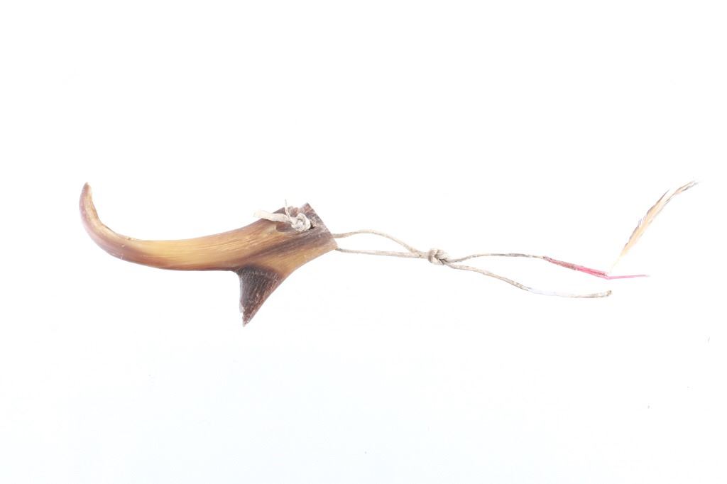The lot features a 19th Century Assiniboine Antelope Horn adornment with Indian tanned hide tie and dyed feather being sinew tied from the Sundog Bruce VanLandingham collection. The Assiniboine were known to use Antelope horns in adornment, war bonnets and headdresses. This examples has been carved and shows a pierced hole holding the thick Indian tanned hide tie. Likely an adornment, or part of a war bonnet headdress at one point. Provenance: From the renowned Sundog Fine Art Bozeman, Montana collection and acquired by Bruce VanLandingham. Bruce VanLandingham was a pillar in the American Indian collecting community and a respected expert. Along with being an avid collector Bruce also was the sole owner of Sundog Fine Art Gallery in Bozeman which was both part museum and gallery. Measures 17"L from the end of the fringe to end of the horn.