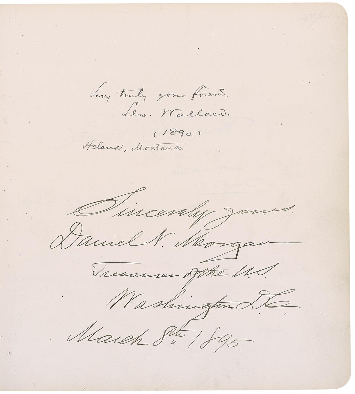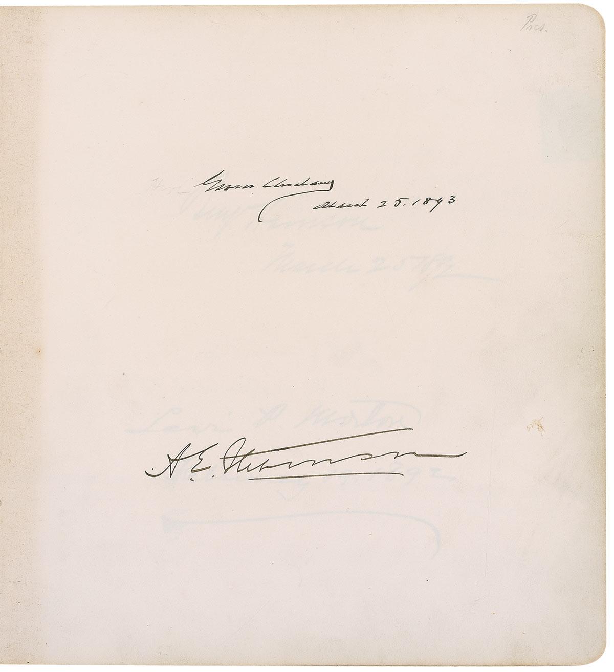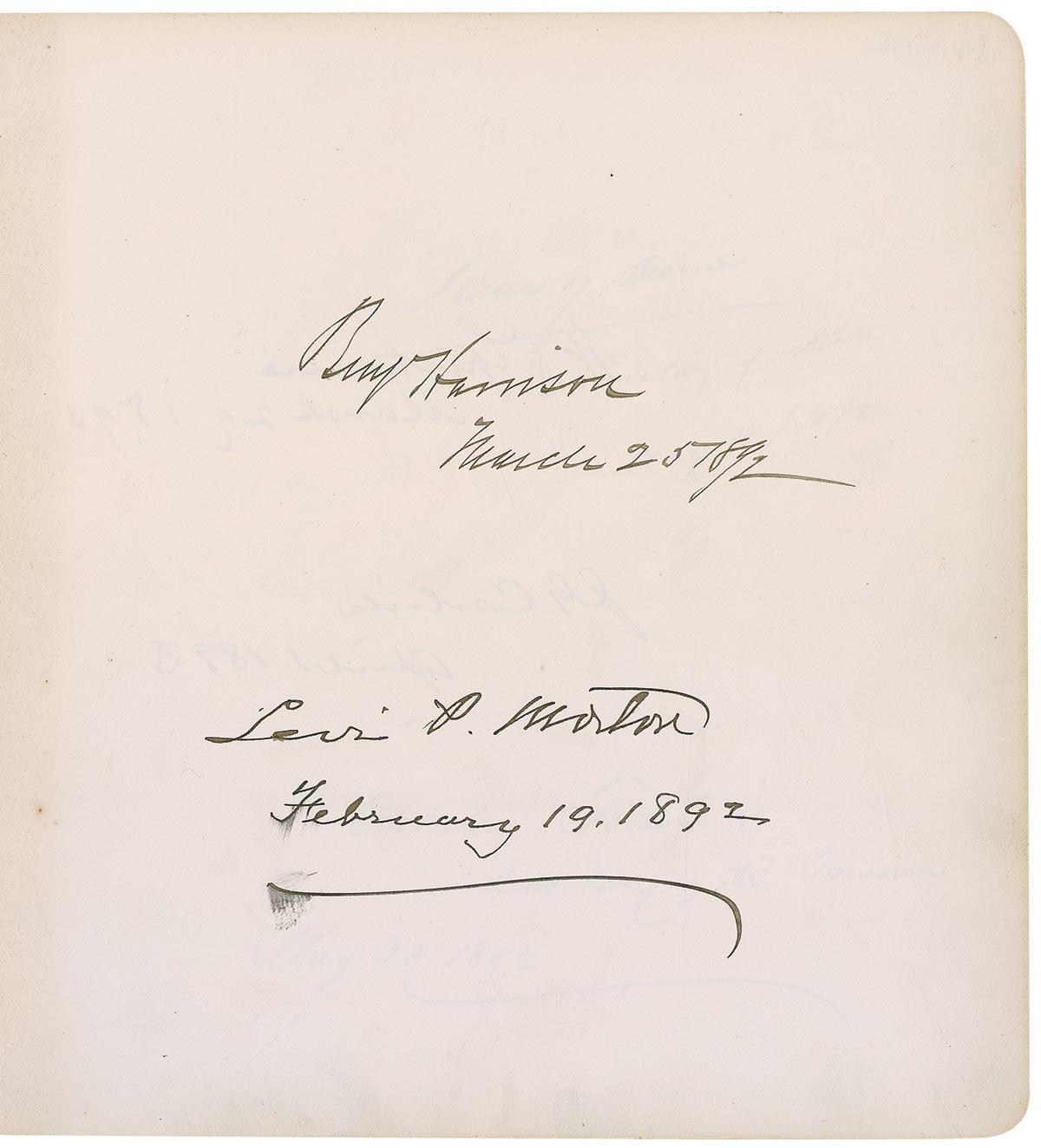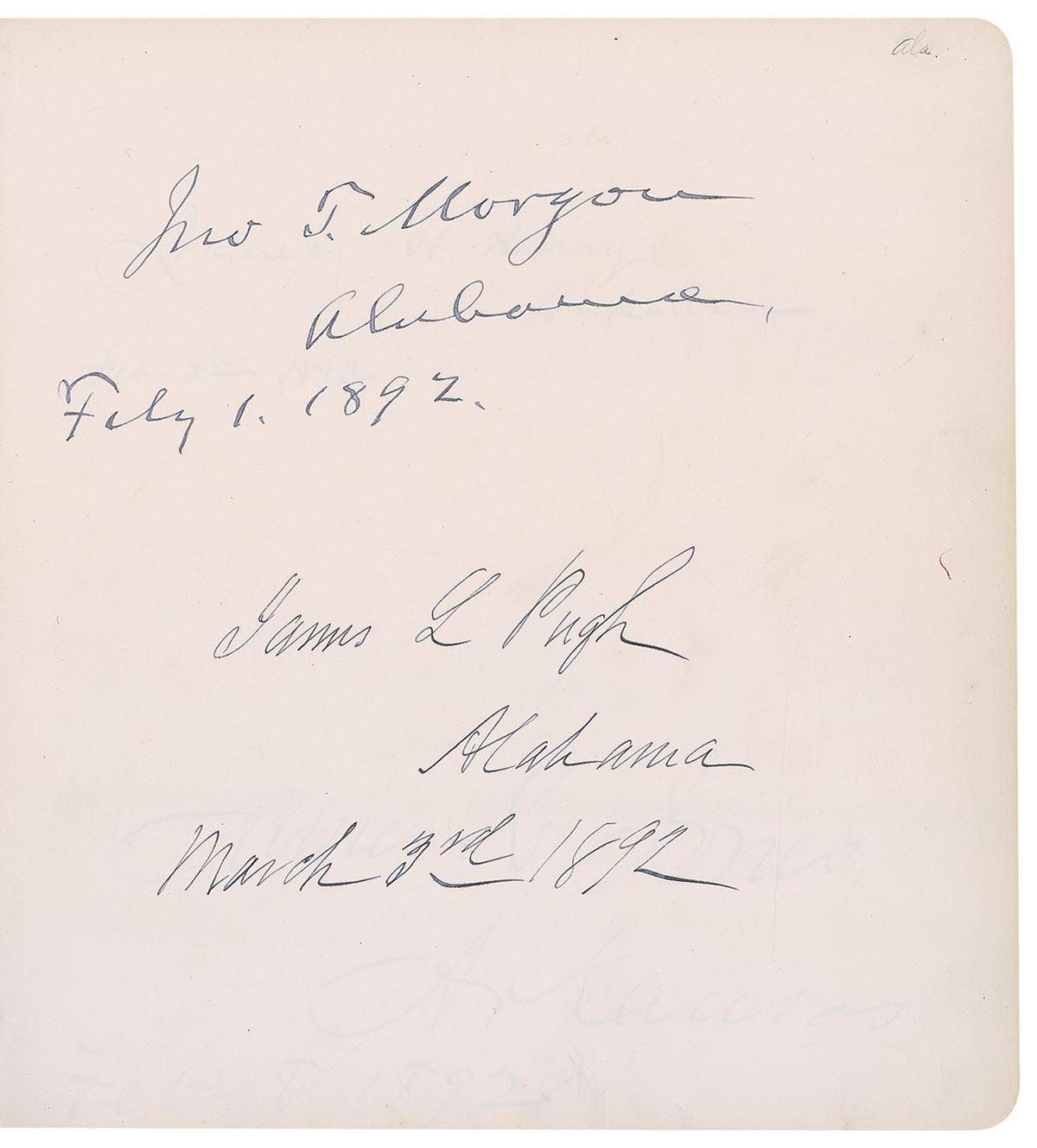 Superb leatherbound autograph album, 8.75 x 9.5, containing 144 signatures of presidents, Union and Confederate generals, politicians, Supreme Court Justices,and other notables, most pages being multi-signed, with just a few back-to-back. Signers include: Grover Cleveland (as president), Benjamin Harrison, Theodore Roosevelt (as president), William McKinley (as president), Warren G. Harding (as president), Lew Wallace, J. M. Palmer, J. R. Hawley, J. M. Rusk, C. F. Manderson, J. B. Gordon, E. C. Walthall, M. C. Butler, W. B. Bate, Frederick Douglass, Melville Fuller, Stephen Field, Joseph McKenna, Samuel Blatchford, Lucius Lamar, David Brewer, Henry Brown, George Shirash, Howell Jackson, George Dewey, John T. Morgan, Randall Gibson, William B. Bate, Matthew C. Butler, Alfred Colquitt, Francis M. Cockrell, and Eppa Hunton. A more comprehensive list is available online at rrauction.com. In fine condition, with a partial separation along front hinge, and scattered wear to covers. A one-of-a-kind collection in well-preserved condition.