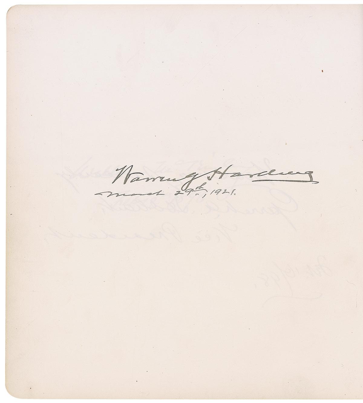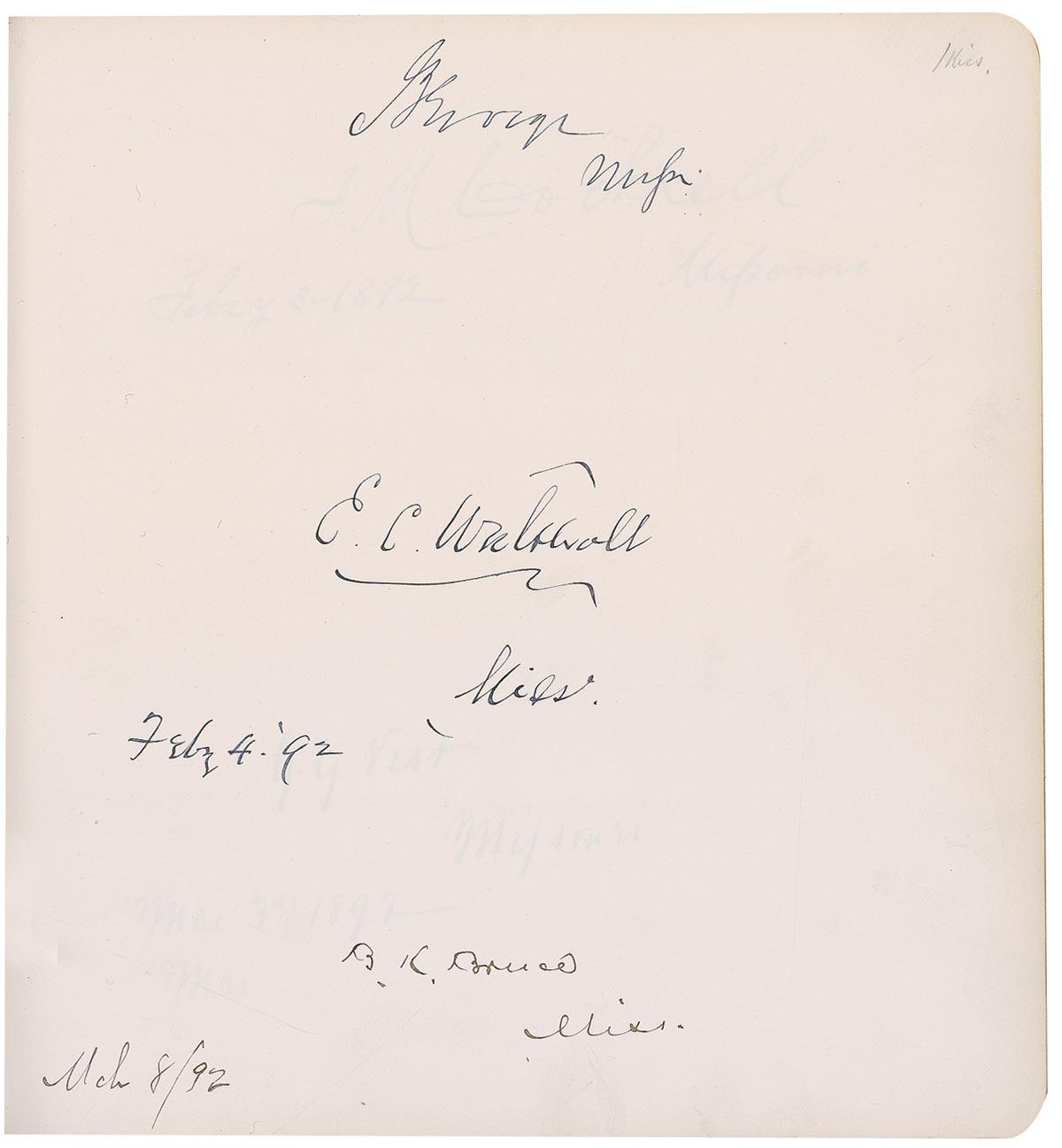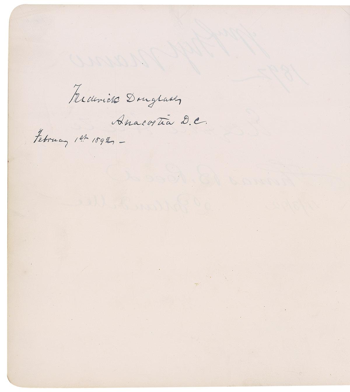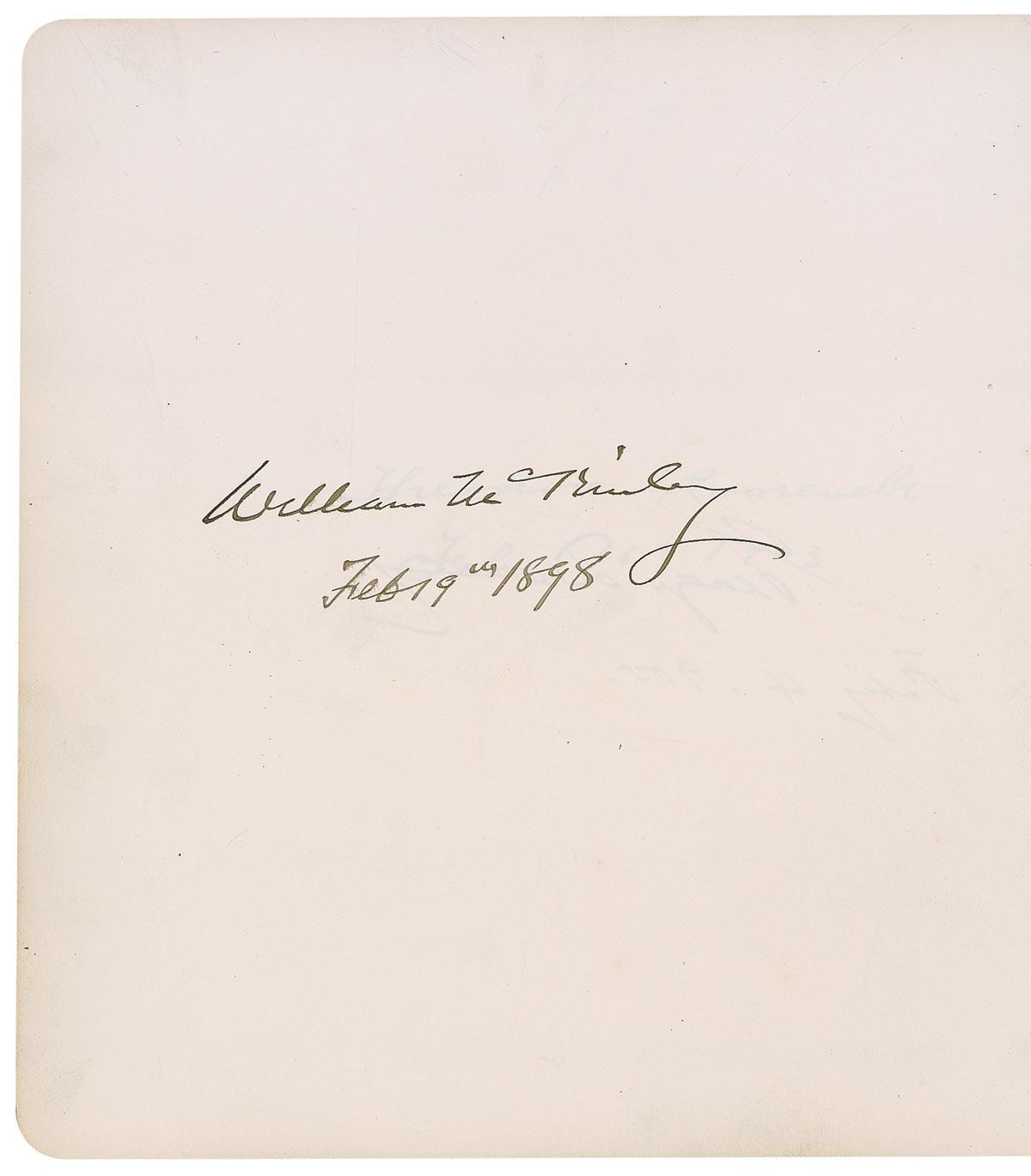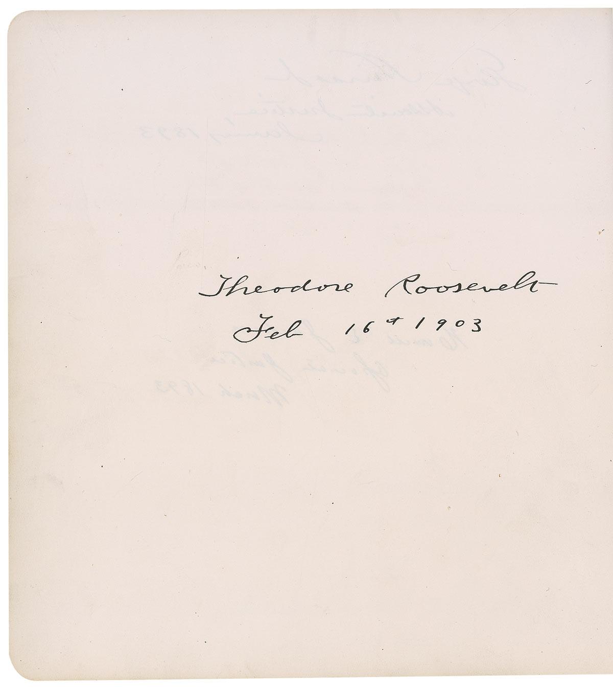Superb leatherbound autograph album, 8.75 x 9.5, containing 144 signatures of presidents, Union and Confederate generals, politicians, Supreme Court Justices,and other notables, most pages being multi-signed, with just a few back-to-back. Signers include: Grover Cleveland (as president), Benjamin Harrison, Theodore Roosevelt (as president), William McKinley (as president), Warren G. Harding (as president), Lew Wallace, J. M. Palmer, J. R. Hawley, J. M. Rusk, C. F. Manderson, J. B. Gordon, E. C. Walthall, M. C. Butler, W. B. Bate, Frederick Douglass, Melville Fuller, Stephen Field, Joseph McKenna, Samuel Blatchford, Lucius Lamar, David Brewer, Henry Brown, George Shirash, Howell Jackson, George Dewey, John T. Morgan, Randall Gibson, William B. Bate, Matthew C. Butler, Alfred Colquitt, Francis M. Cockrell, and Eppa Hunton. A more comprehensive list is available online at rrauction.com. In fine condition, with a partial separation along front hinge, and scattered wear to covers. A one-of-a-kind collection in well-preserved condition.