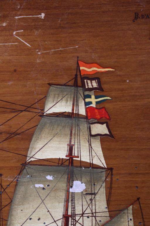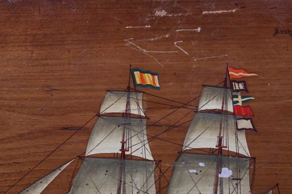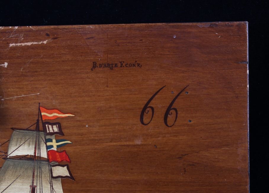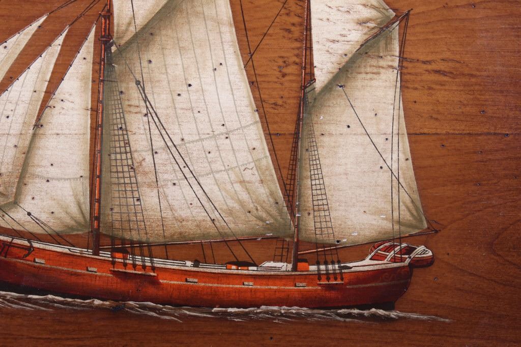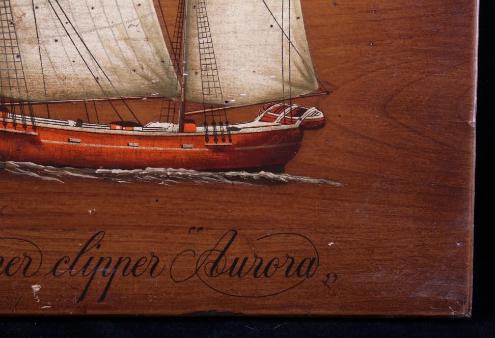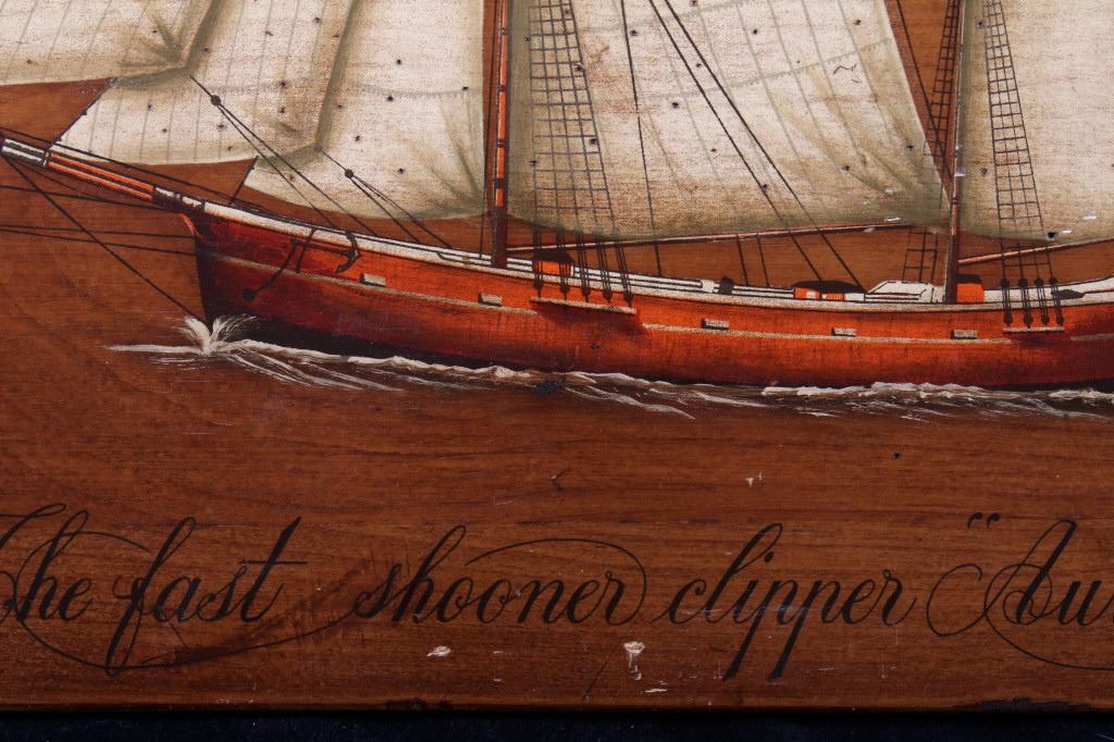 Included in this lot is a pair of B. D'Arte F. Conz sailing ship paintings originating from the 19th century. The pieces display masted sailing ships painted across wood boards. The first of the ships displays a two masted clipper with a nice red hull and two flags on the masts. The piece is marked "B. D'Arte F. Conz 1841 The Fast Shooner Clipper "Aurora"". The second painting is of a large, two masted ship with numerous sails and a row of flags across the back mast. The piece is marked "B. D'Arte F. Conz 1866 - The Two Masted Ship "Perica"". The boards show fair condition overall, with some wear and scratches across the faces of the art. The boards measure 17 1/2" wide by 13 3/4" tall.