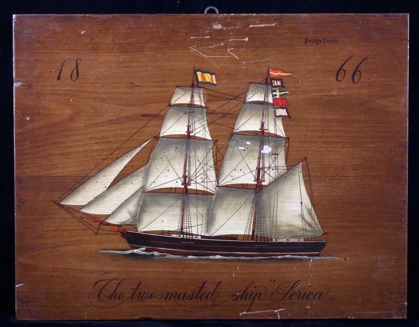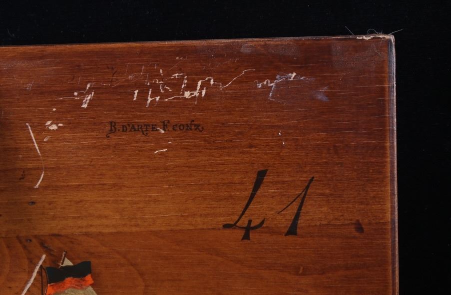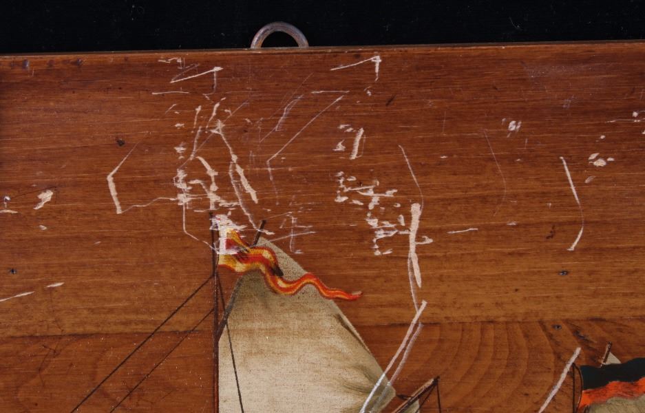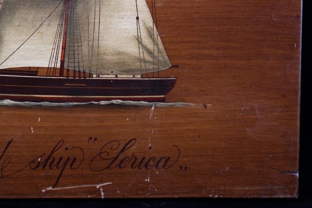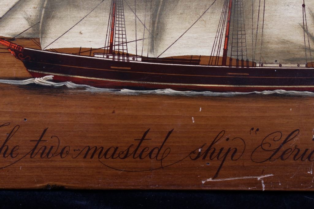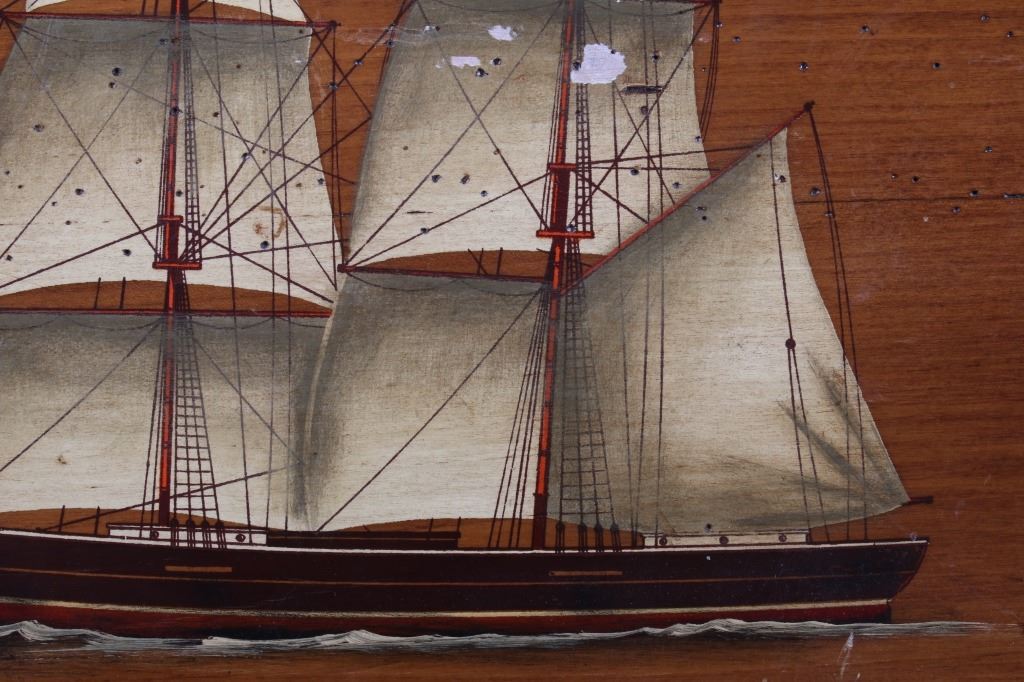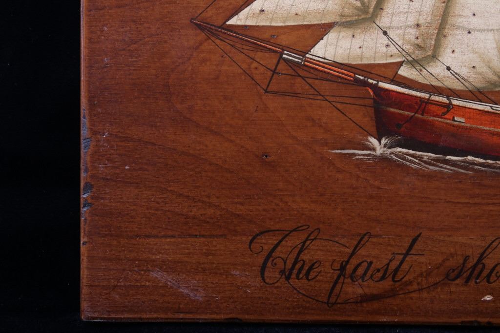 Included in this lot is a pair of B. D'Arte F. Conz sailing ship paintings originating from the 19th century. The pieces display masted sailing ships painted across wood boards. The first of the ships displays a two masted clipper with a nice red hull and two flags on the masts. The piece is marked "B. D'Arte F. Conz 1841 The Fast Shooner Clipper "Aurora"". The second painting is of a large, two masted ship with numerous sails and a row of flags across the back mast. The piece is marked "B. D'Arte F. Conz 1866 - The Two Masted Ship "Perica"". The boards show fair condition overall, with some wear and scratches across the faces of the art. The boards measure 17 1/2" wide by 13 3/4" tall.