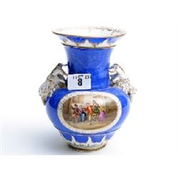 19th Century Berlin vase surmounted by ram's head, with painted panel 'revellers' scenes on marbled blue ground. Height 7"