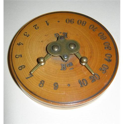 A most unusual Victorian games counter, a wonderful piece of engineering with it's ratchet / cog wheel mechanisms operating the pointers.<p>The underside reveals the original paper. Absolutely splendid condition in perfect working order; measuring 2 3/4" in diameter. A wonderful addition to any antique games collection.