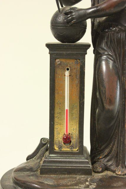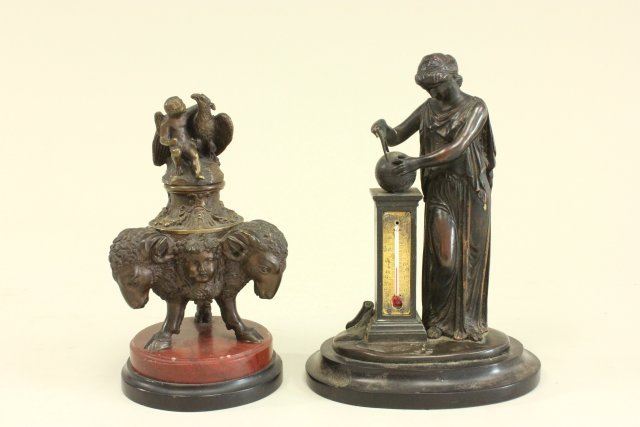 Inkwell with ram's masks and putti. Thermometer with classical maiden. The larger approx. 8" H.