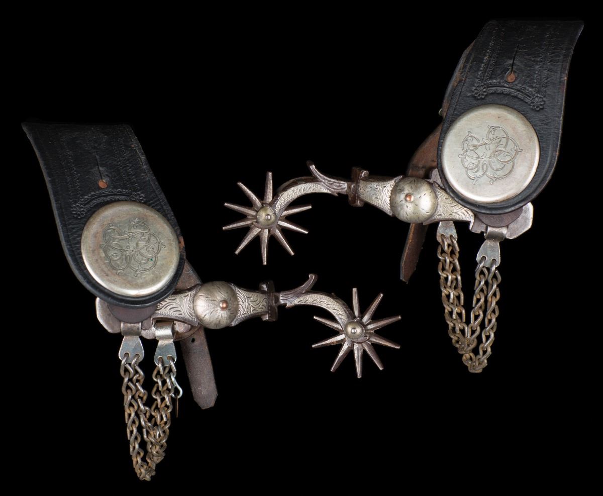 19th century silver inlaid "transitional style" California spurs, with birdshead shanks, rolled chap guard, 2" ten-point iron rowels, chased off-side, vaquero heel chains, inlaid heel bands with 1" domed and engraved coin silver spots, lone tooled two-piece leathers with 2" monogrammed silver conchos. Circa 1880s-90s.