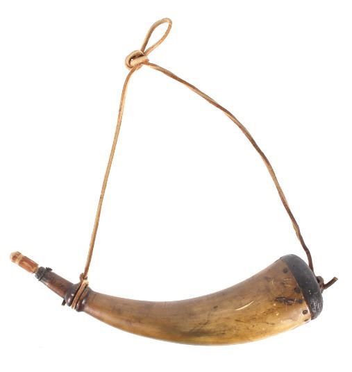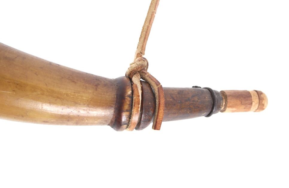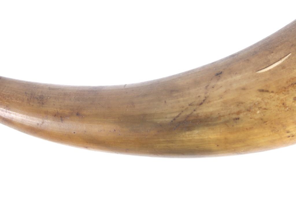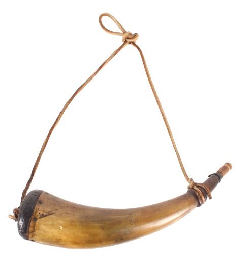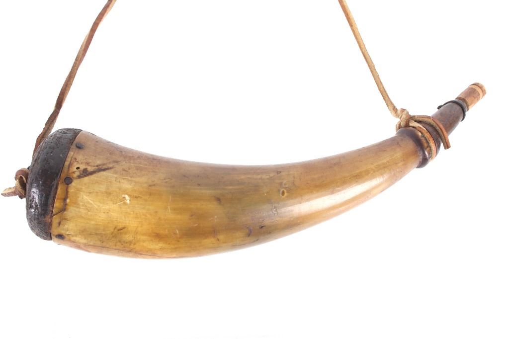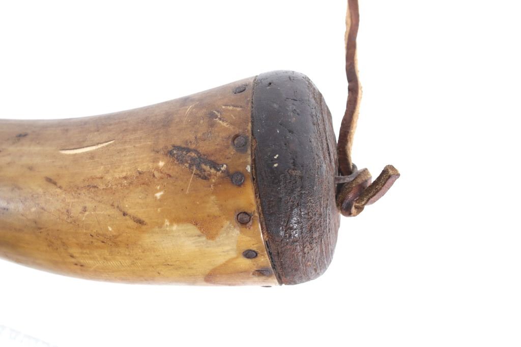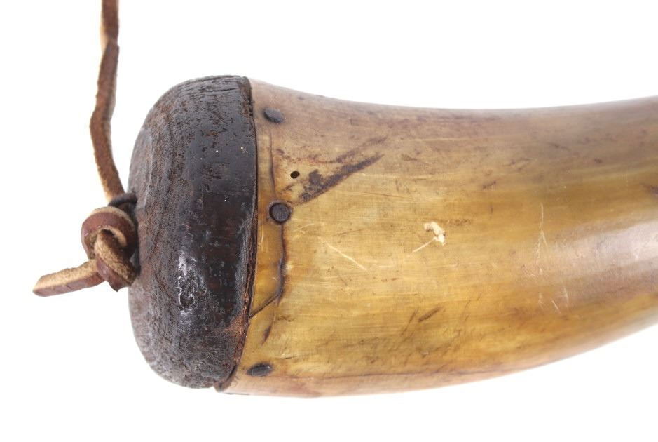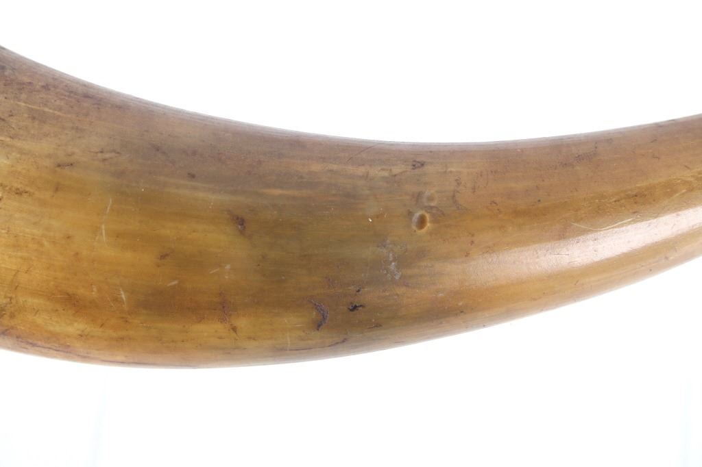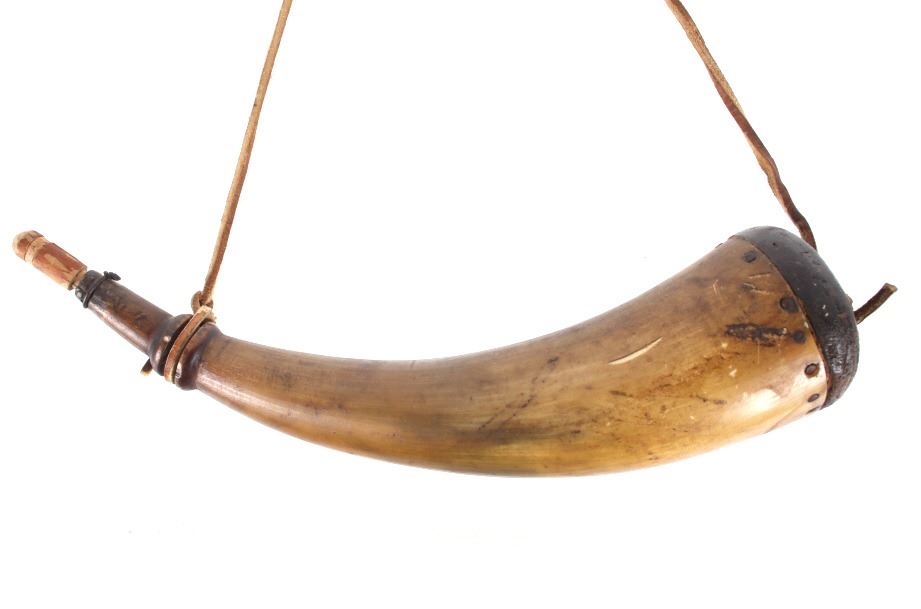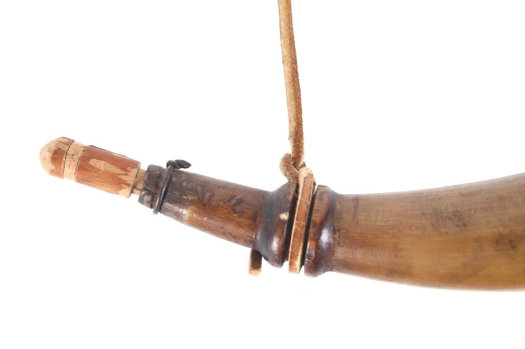 Featured in this lot is this 19th century carved steer horn powder horn. The powder horn features a wonderfully and professionally carved steer horn construction that shows a wooden base and stopper and shows a hand carved rut that is strung with a leather lanyard and is tacked at the base to create the loop. The condition of this powder horn is is good with no obvious signs of damage and in good overall condition. The measurements of this powder horn are 9 1/2" x 2 1/2" x 5".