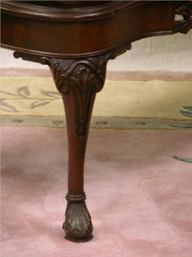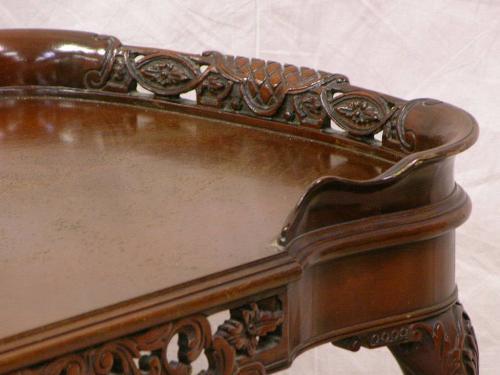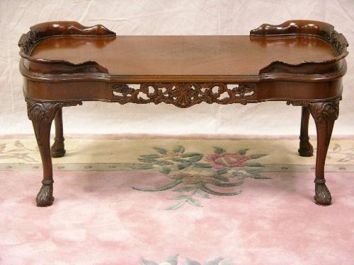 A 19th century carved mahogany coffee table with pierced sides, pierced carved galleries sides of the top, acanthus carved legs and feet. Glass provided for table top protection ( two chips on edge of glass). Dimensions: 18.5" high x 40" long x 20" wide