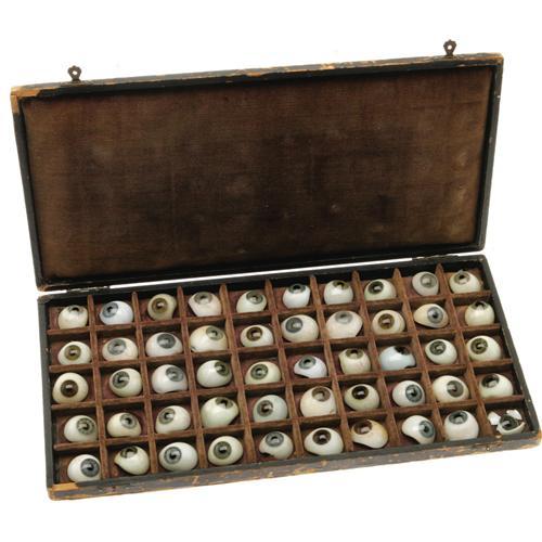 <B>19th Century Case of Sample Glass Eyes.</B></I> In the 19th century when a person lost an eye due to infection, gunshot, or accident it was possible for them to replace the lost eye with a glass one. This lot features a salesman's case of glass eyes, 50 in all, of different colors and shapes. Only one is broken, the other 49 are in perfect condition. Even the veins in the white parts of the eye are visible. Keep your eye on this lot...