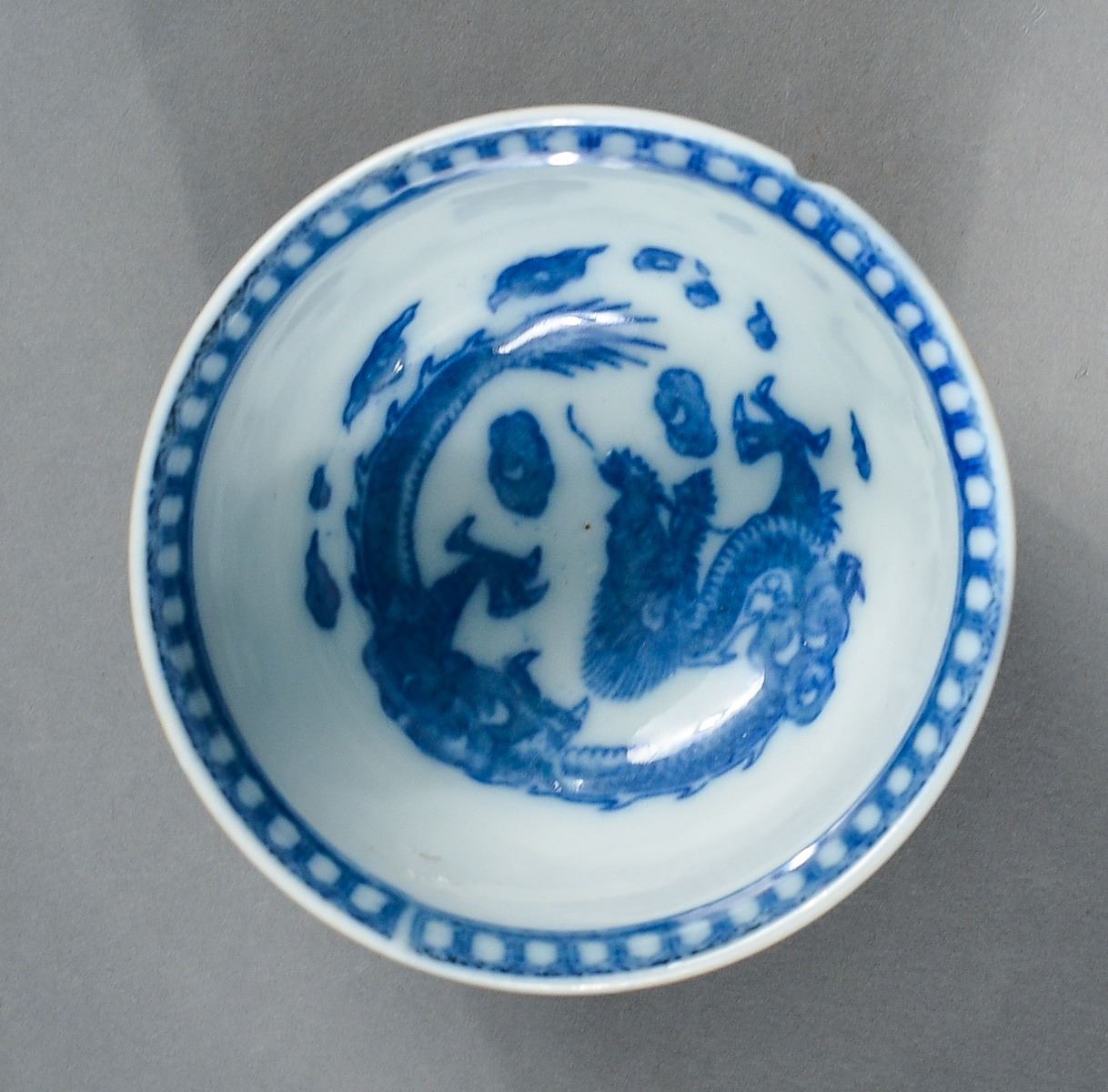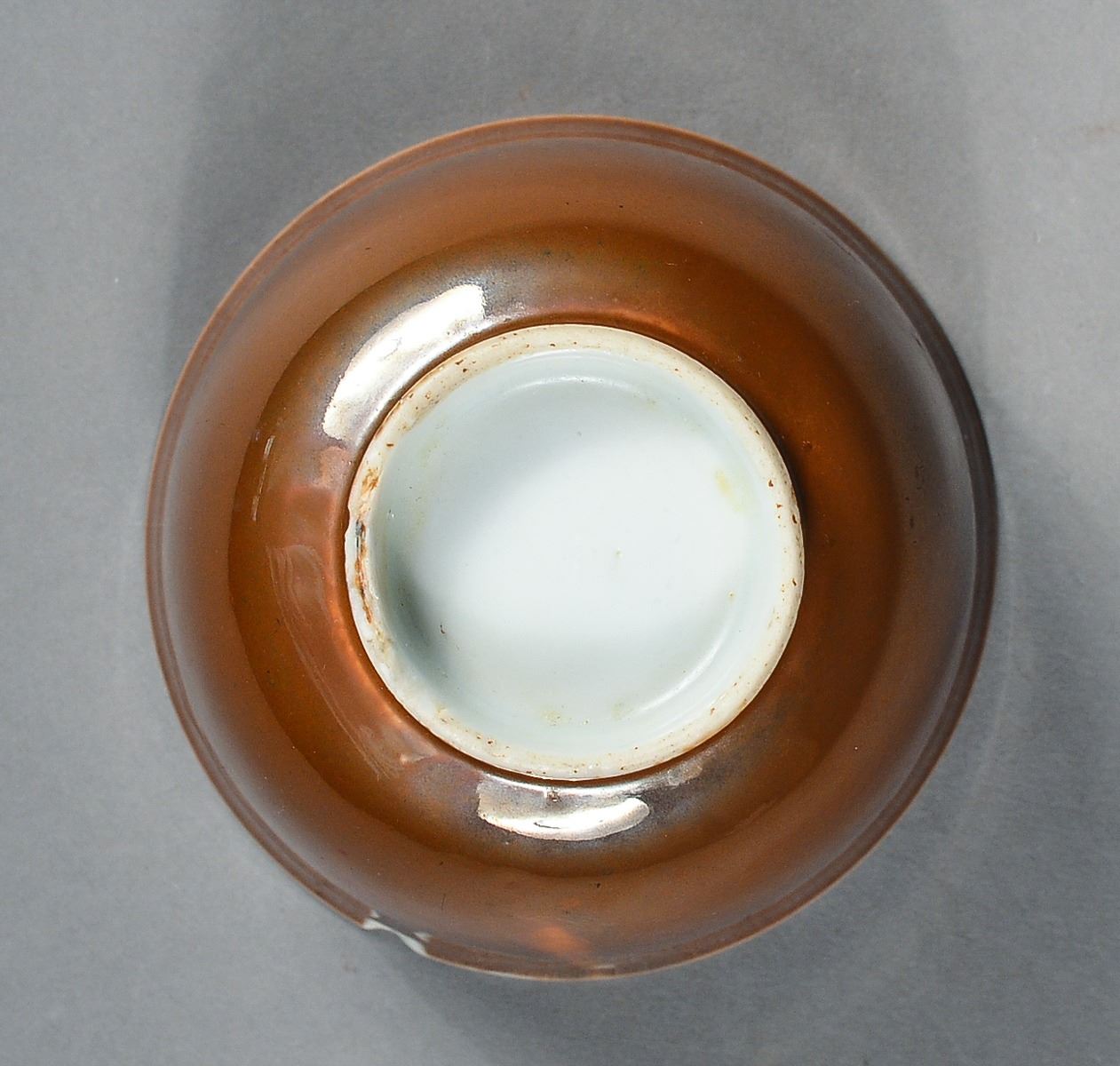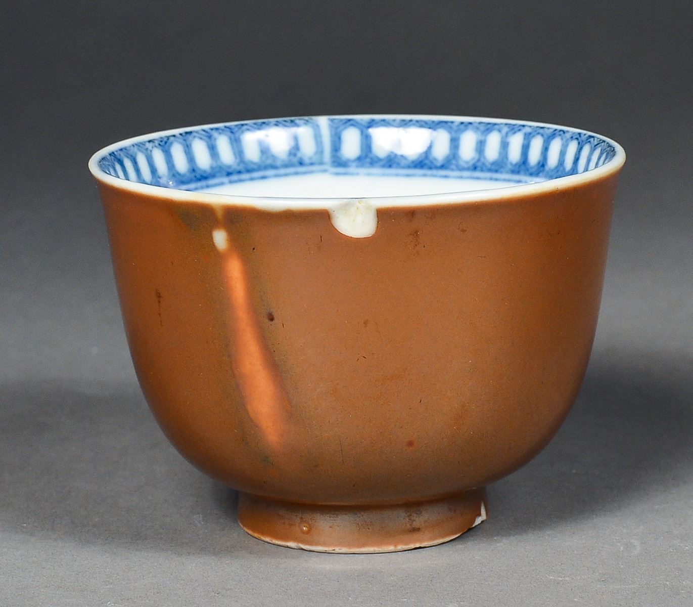 Chinese porcelain teacup; the exterior with cafe au lait colored glazed; the interior with blue and white dragon design (rim chip), 19th Century ; 2 1/4" tall, 3 1/4" diameter