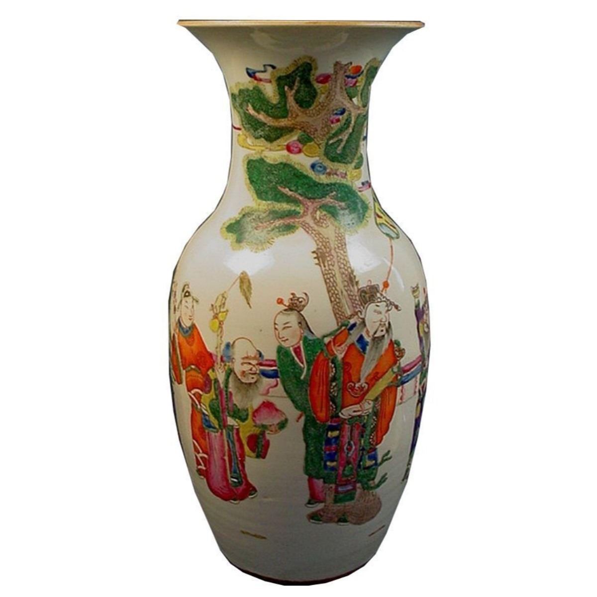 19th century, chinese export porcelain vase decorated with hand painted overglaze enamels in the famille rose color palette and the painting depicts the emperor and his entourage and visitors standing under a pine tree. Being export porcelain, the vase is not signed and it doesn’t have any identifying marks; but we believe it was made between 1880 and 1899. The vase stands a little over 16¾ inches high and almost 8¼ inches in diameter at its widest point. There is a short stress hairline in the glaze on its reverse side and there was a two-piece chip on its rim that has been re-glued in place; otherwise, the vase is in very good condition, without any other damage or repairs and virtually all of its hand painted overglaze enamel decorations are intact.