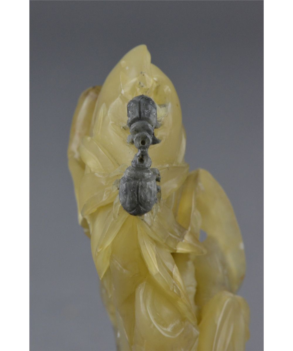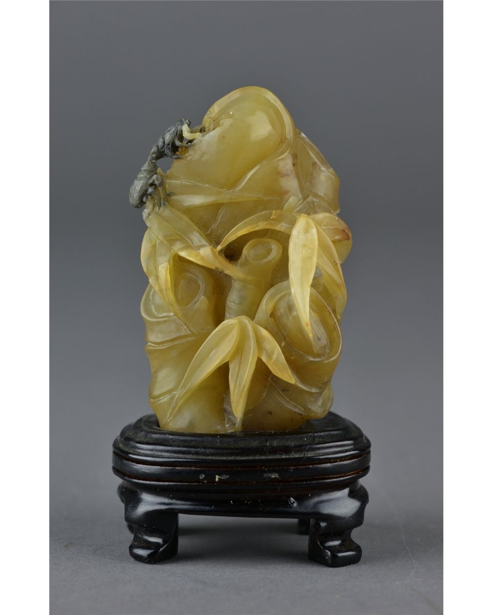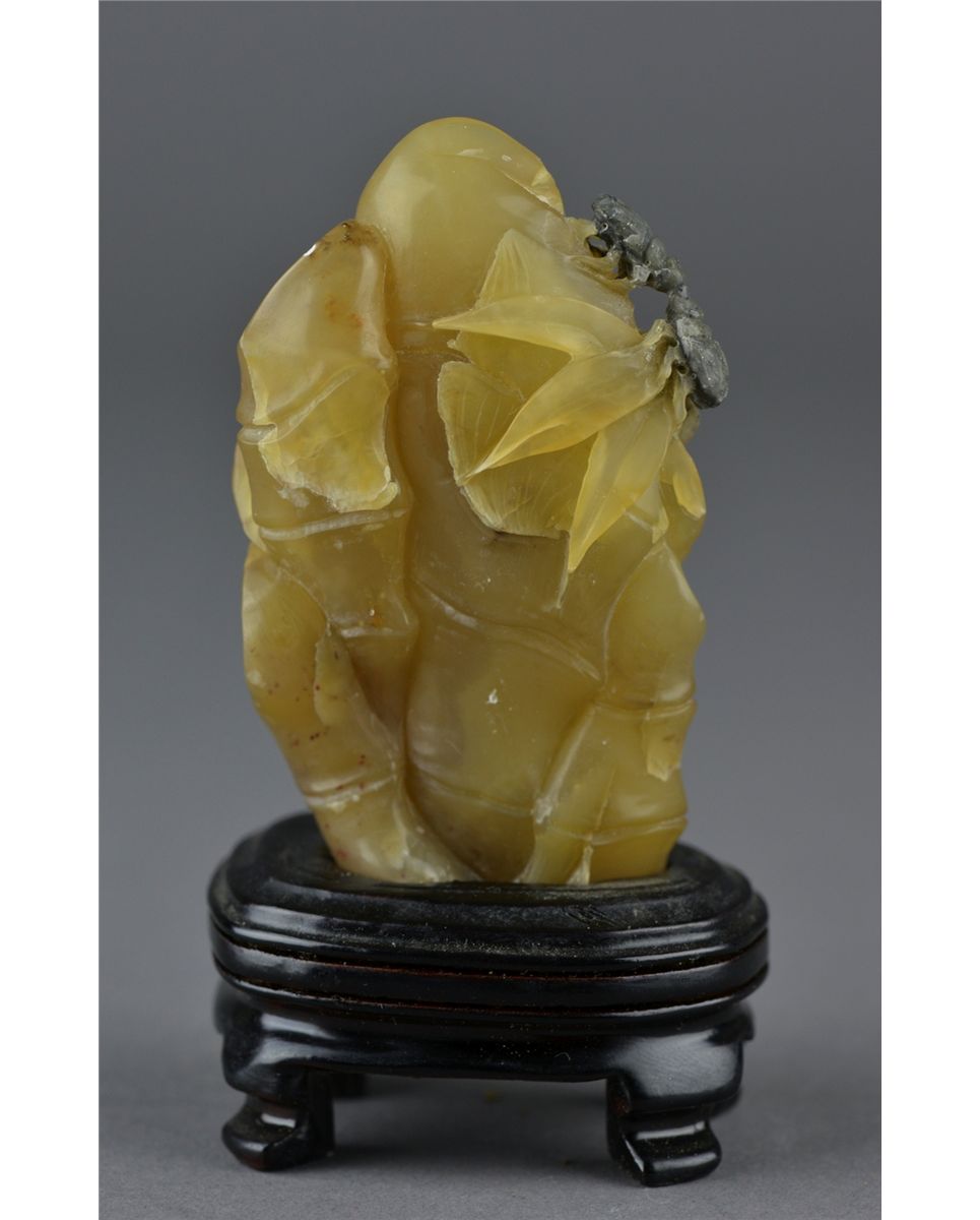 19th Century Chinese hardstone carved boulder, featuring bamboo stalks and a pair of cicada on the side in relief, the stone of translucent yellow tone; H: 8 cm, 109 grams, wood stand