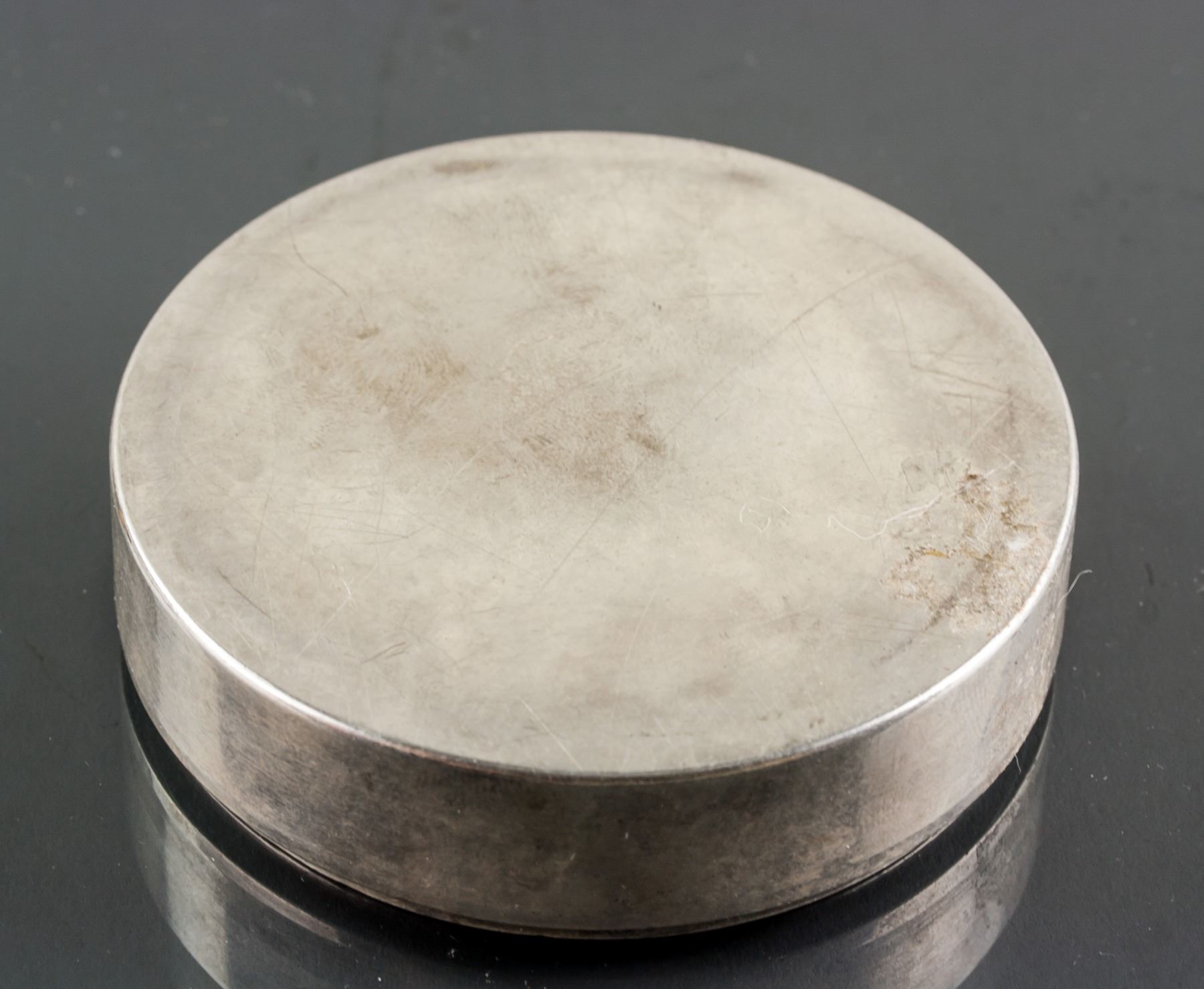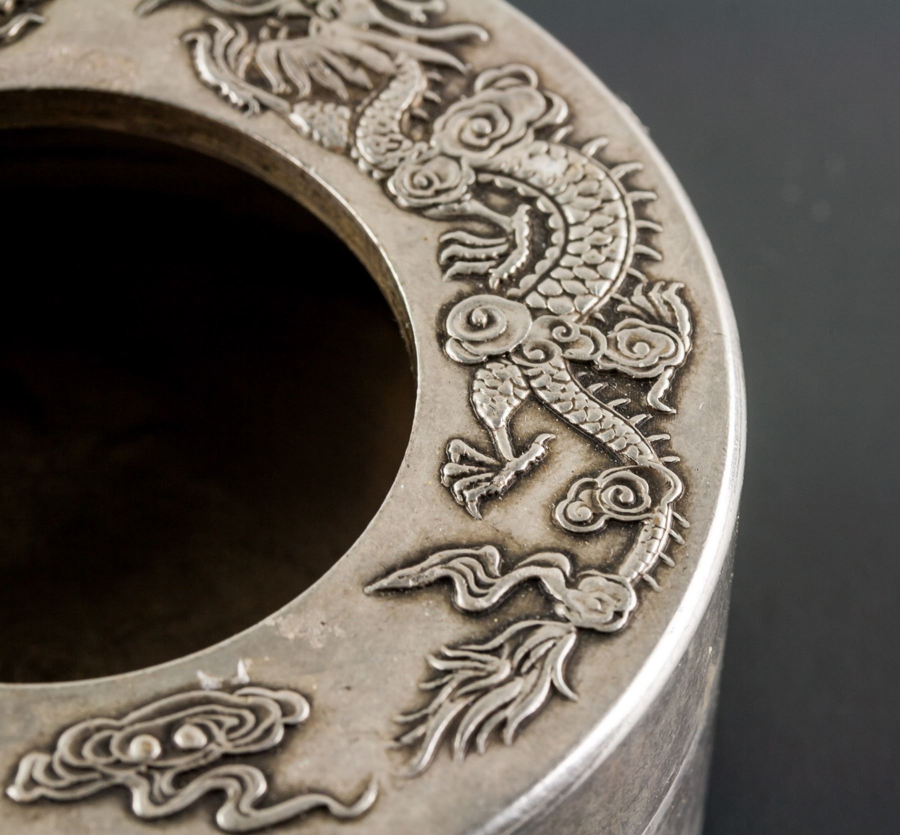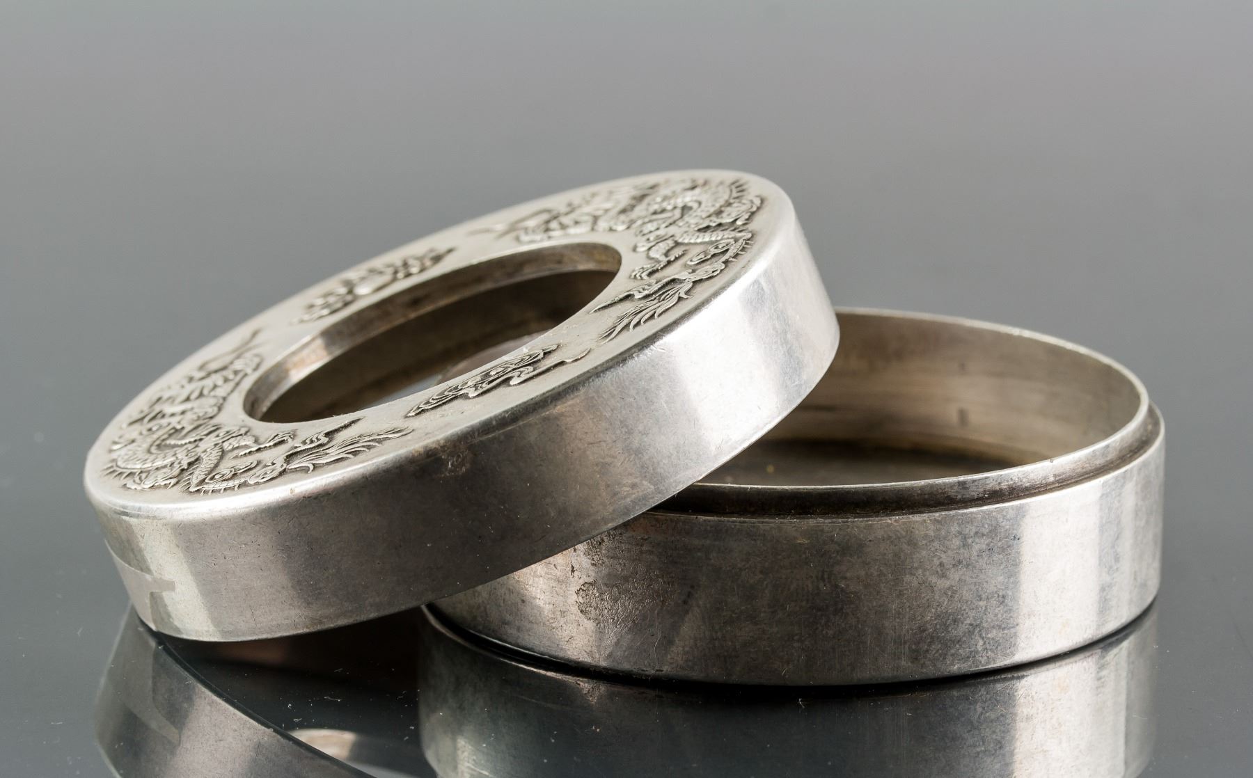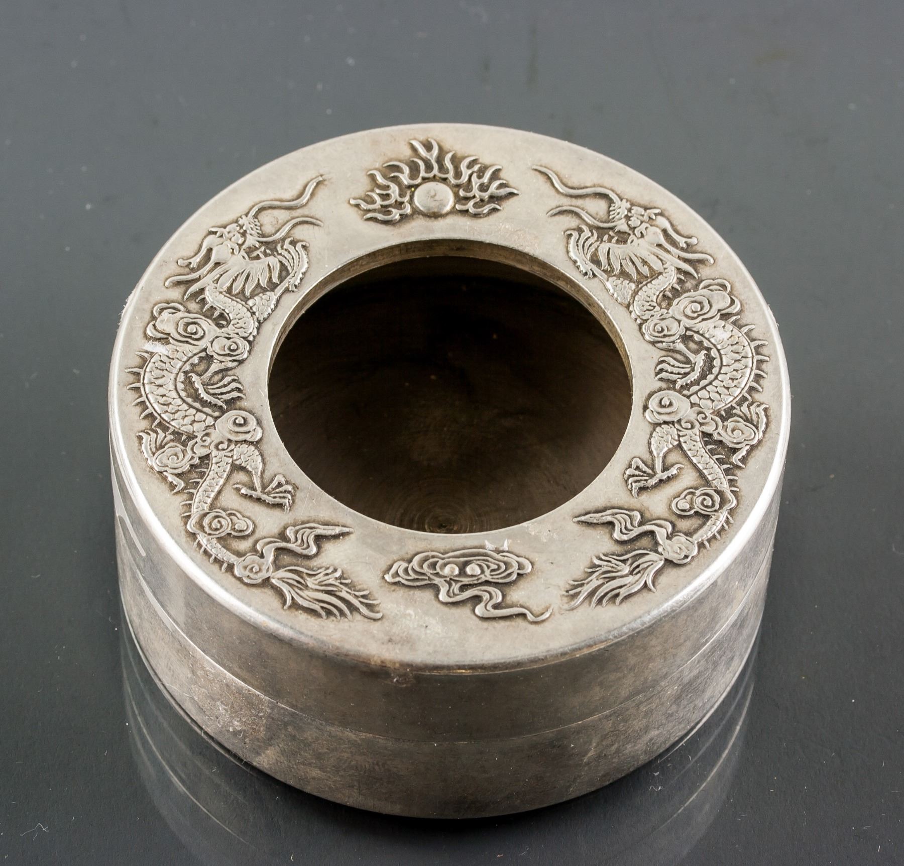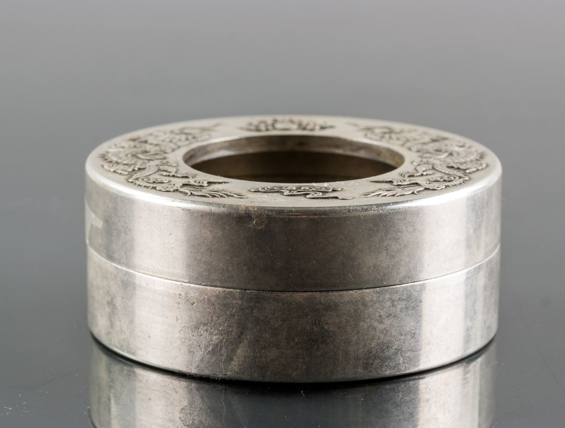 19th century Chinese silver case with lid, of round shape, lid carved dragons, 3 x 7.5 cm, 308 grams