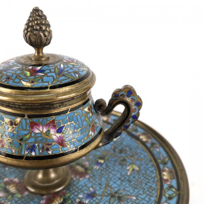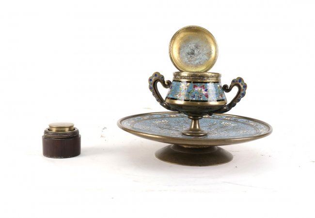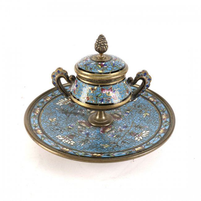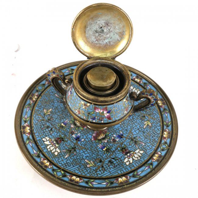 19th century enamel on bronze cloisonne inkwell. Insert is not original. [6 3/4" Dia x 5 1/4" H].