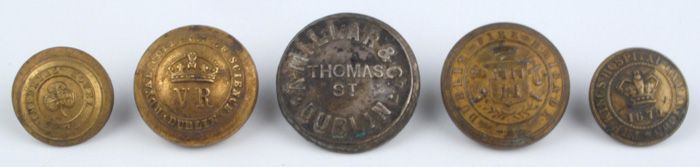 A selection of mostly 19th Century rish related buttons including examples from Dublin Fire Brigade, The King's Hospital Oxmantown, Royal College of Science Dublin, Millar & Co. Thomas St. Dublin, Imperial Hotel etc. Also with enamel pin back badges of the National Federation of Women Workers, British Red Cross Society and Royal Dublin Society. (17 items)