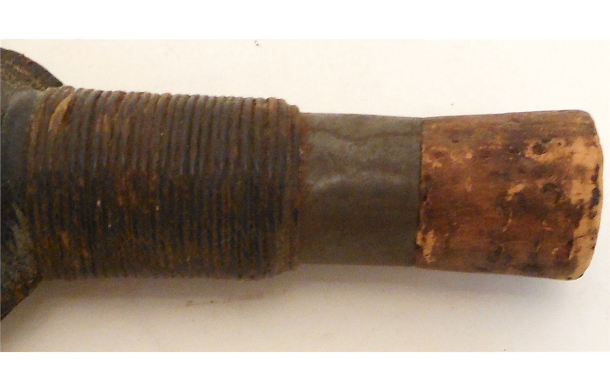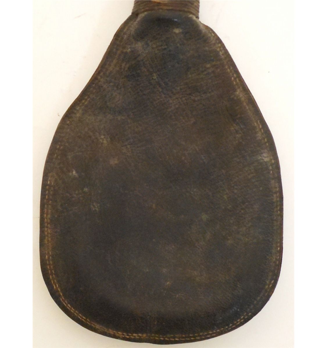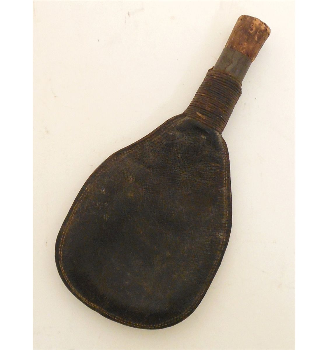 7 1/4" leather ball flask with corked metal spout, leather is pliable. Great condition.