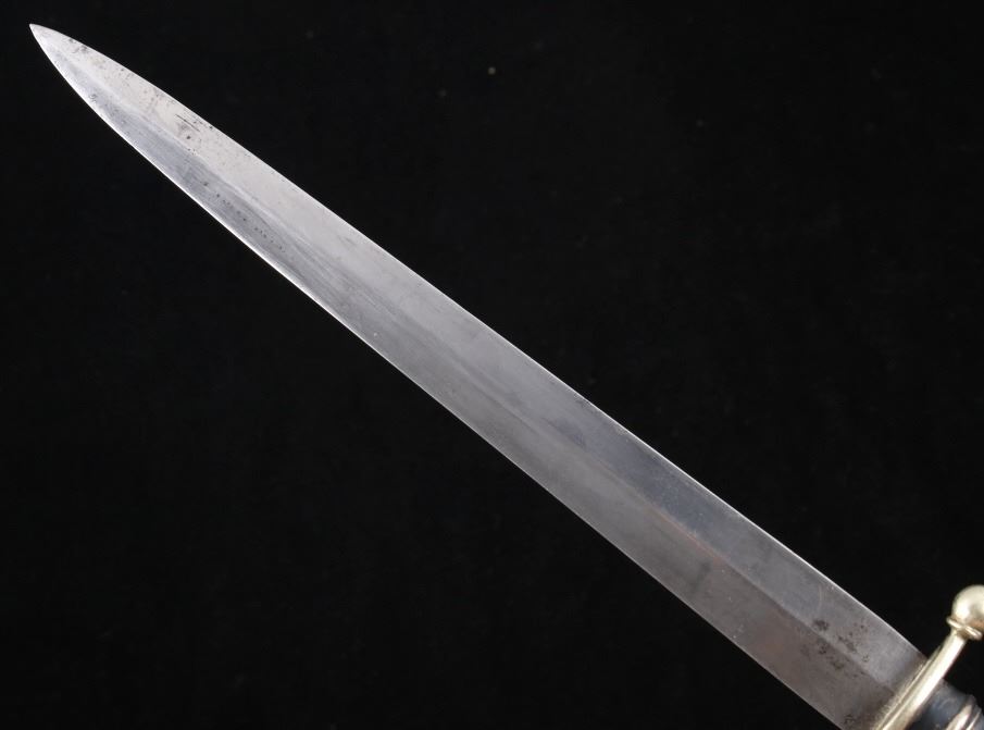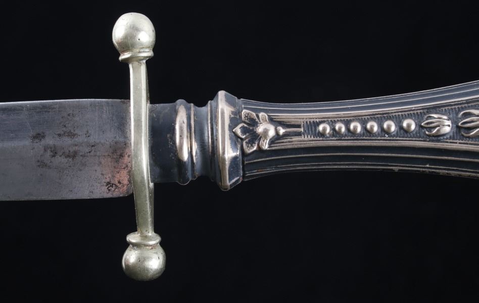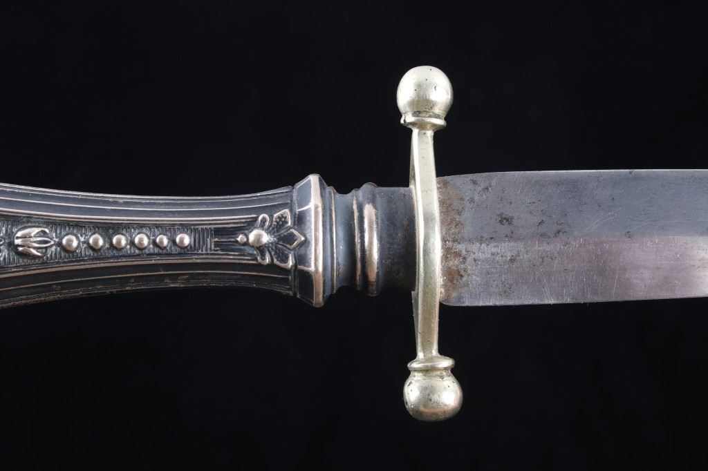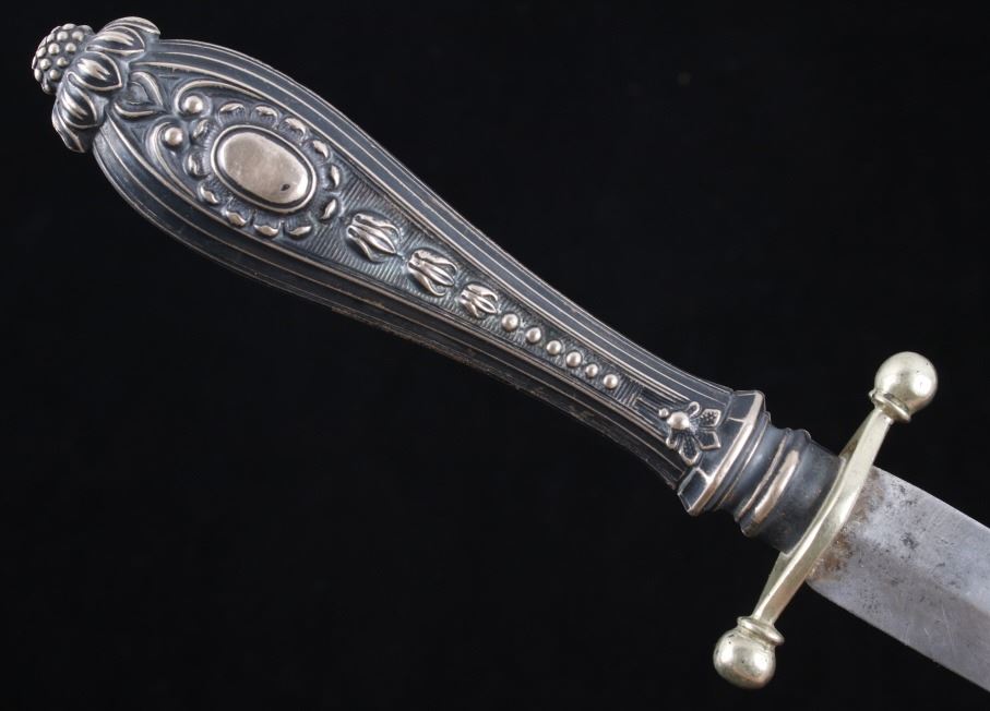 Included in this lot is an embossed silver handle stiletto knife and leather sheath. The knife displays a double edged steel knife blade with a simple guard and cast silver grips. The handle features embossed designs across the handle. The handle is marked "FF" across one side. The knife comes with a sheath with metal and brass accents. The knife shows good condition overall and some wear; the guard is loose. The knife measures 11 3/4", with the blade being 7 1/4" long.
