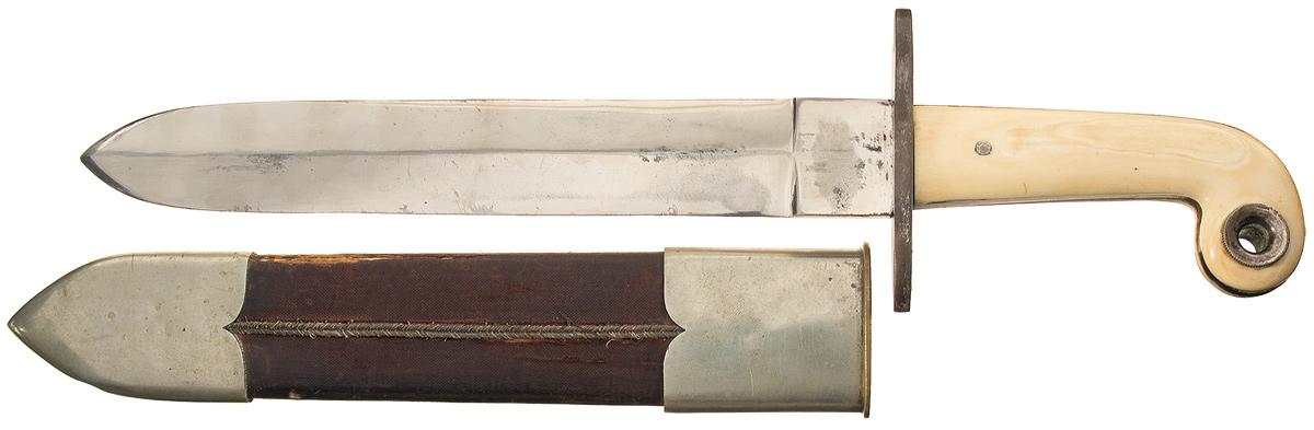 The bowie was in the Bill Williamson bowie sale. Measuring 9 1/4" long, the blade is unmarked. Oval shaped iron guard. The bowie knife has the rarely seen mameluke hilt. It is fitted with ivory scales with a single rivet. OAL: 13 3/4". Complete with a canvas bound wooden sheath with silver tip and throat.