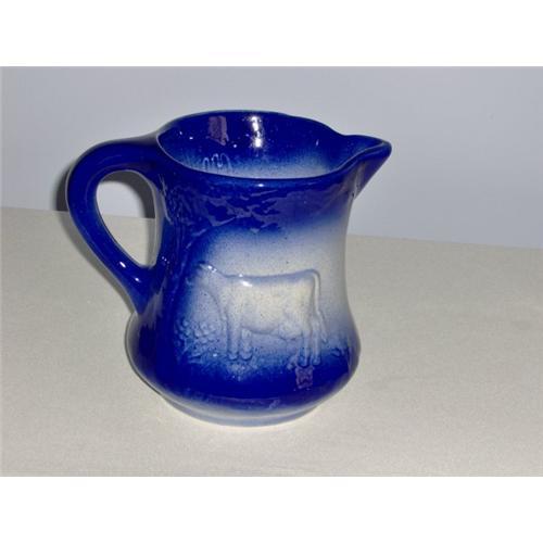 This late 19th century English ironstone milk pitcher has a flow blue and impressed cow design. It is in near mint condition for its age!</em></td>