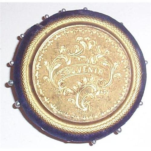 The Victorian blue velvet pin cushion is held between two ornate gilt metal discs.<p>One side has the word "Souvenir" stamped in the center of the decorative stamped design.<p>Dating to around 1880, this would have undoubtedly been picked up on one's grand tour probably in England, but perhaps France.<p>The fabric remains in excellent condition, measures 1.75' in diameter. A wonderful addition to any antique sewing collection.