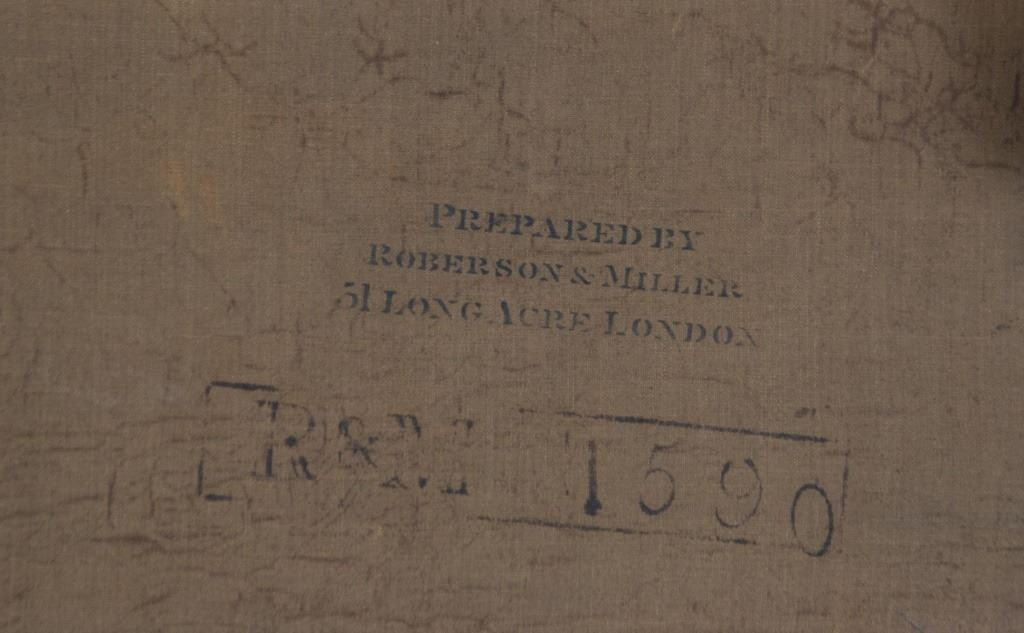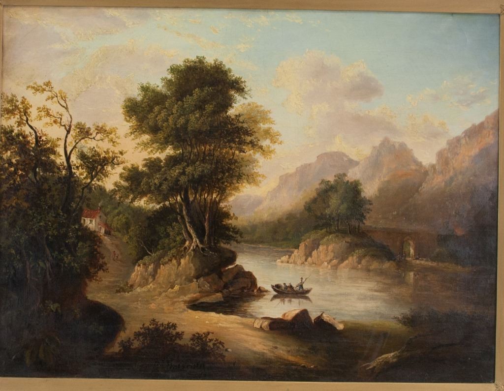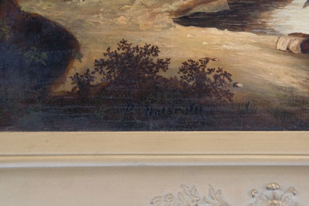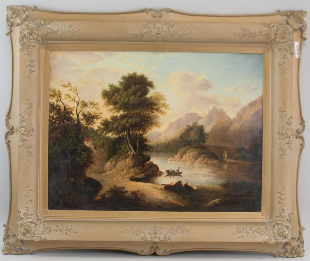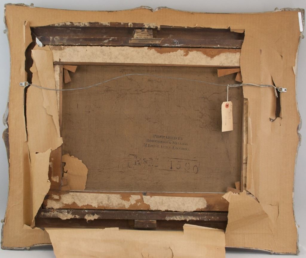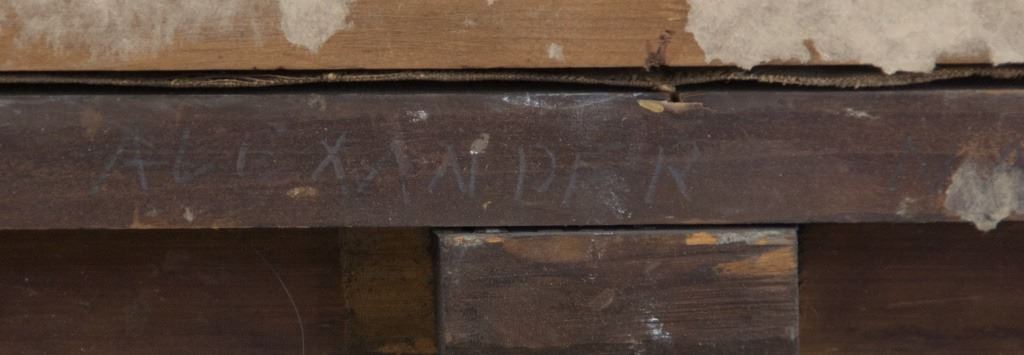 Oil on canvas, framed. Featuring a landscape scene. Signed illegibly no the lower right corner. Half torn label affixed to stretcher bar. Stamped "PREPARED BY ROBERSON & MILLER 51 LONG ACRE LONDON / R & M 1590". Inscribed ALEXANDER on the stretcher bar in pencil. Gallery tax inscribed I.M.T.gde / DSS9 / and dated JUN 26 1982.