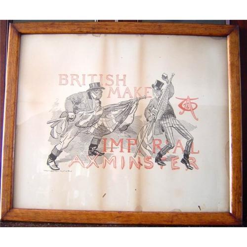 In wonderful original oak frame and glass. "British Make Imperial Axminster" is the slogan. Dated 1898 on lower left hand corner. Shows some age and wear with vertical streaking. Researched, and we cannot find another like it. In good condition.