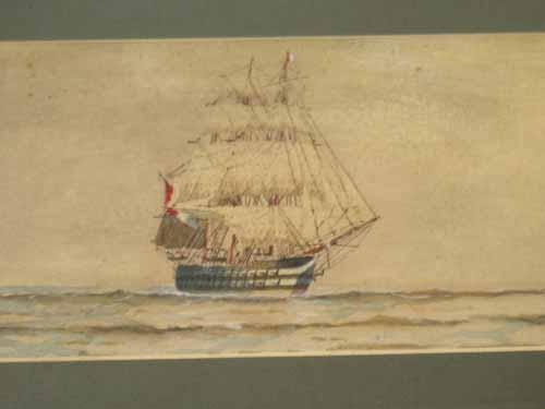 19th Century English School - Man-o'-War under sail - watercolour; and a pair of engravings, 12cms x 25cms (w/c Man-o'-War) £100-150