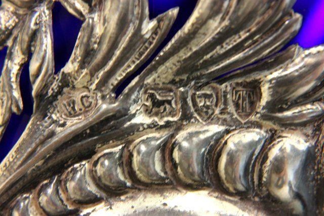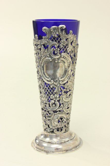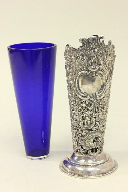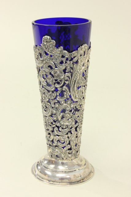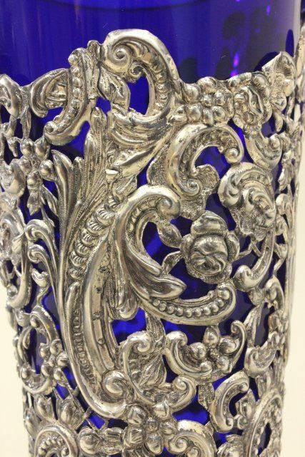 With cobalt blue insert. Decorated with flowers. Approx. 11 ozt. Approx. 10 1/4" H.
