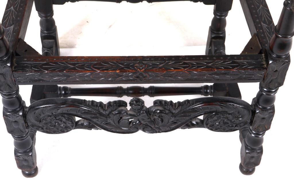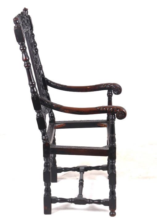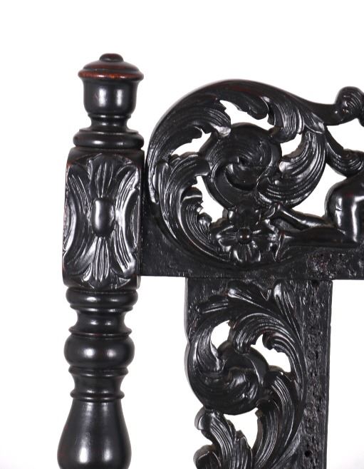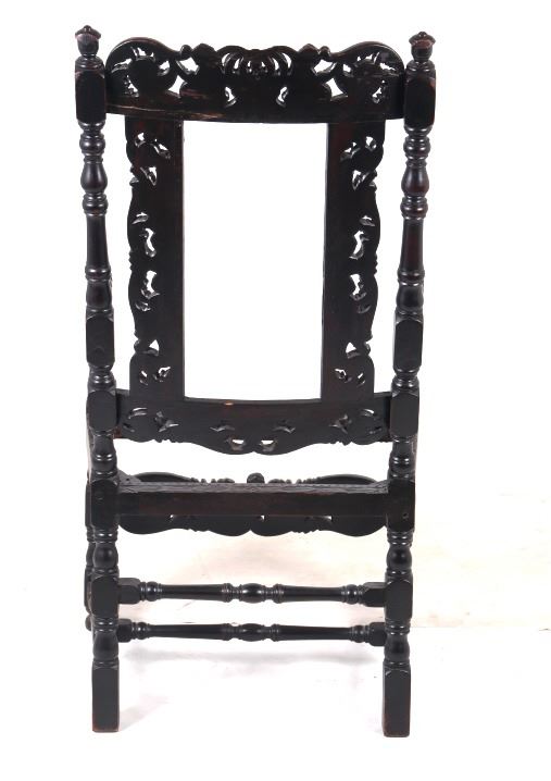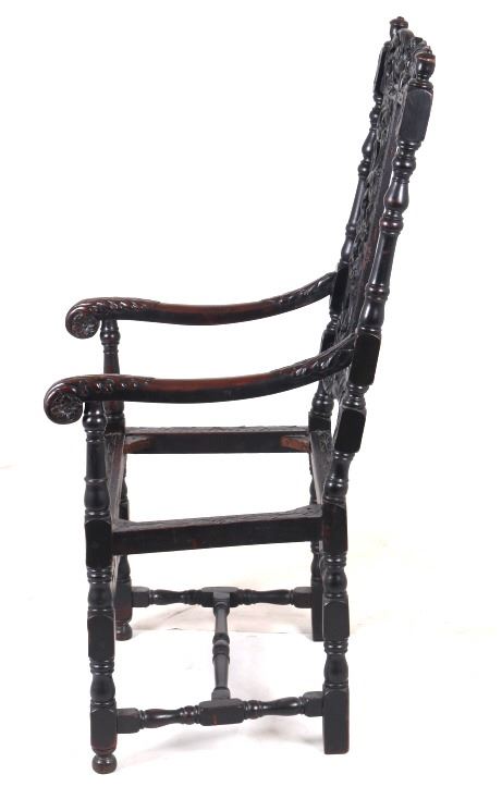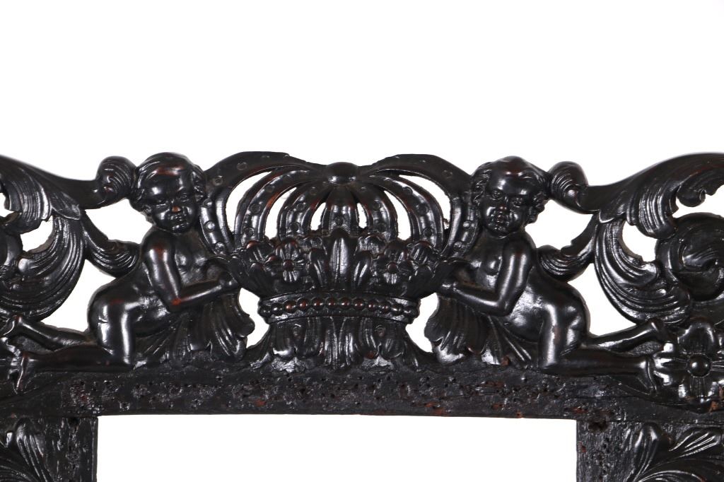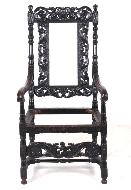 For your consideration, a superb 19th Century Flemish Baroque style carved throne chair. The chair features an intricately carved top rail with a crown in the center; the crown is flanked by two cherubs and scroll work. A carved stretcher on the front features a cherub flanked by scroll work. Gently curved arms with carved foliage, carved seat frame and turned legs, stretchers and arm supports finish out the style of this grand chair. The chair is marked on the bottom in two places, "Made in Belgium H.T.M." It was not determined what "H.T.M. stands for. This chair is in excellent condition, though it is noted that the chair was made with a cane back and seat, which are both missing. The chair measures 24 1/2" W x 25" D x 47 3/4" T.