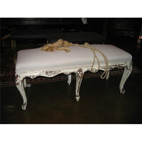 19th century French Louis XV style hand-painted bench, newly upholstered with white linen.