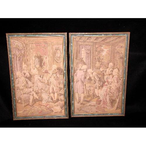 Pair of 19th century French framed tapestries depict a parlor room setting in one with a woman playing the piano,a man the violin, for the enjoyment of two male guests. All dressed in costume of the day with ornate surroundings. The other shows a servant announcing a caller to a royal family (mother with child seated on her lap and father) who is bowing in greeting to the male royal member. Both in antique cream background with brown highlights and hints of rose and blue woven in the tapestry. The wood frames have ornate outer lip in antique gold,plain antique gold inner lip with middle 1/2 inch in marbleized blue and rose pattern. Both in excellent condition,original nails in back. Measure 21H X 14L X 1D.