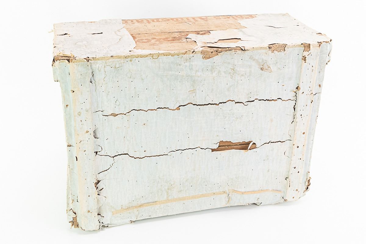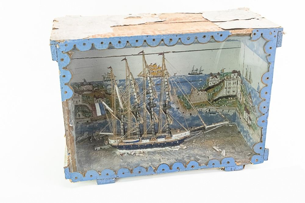 A full-rigged French ship in a wooden and glass display case. The plaster waves have broken loose in places. The ships rigging and sails are in great shape, with flags flying. There is some paper and wood loss on the case. The case is made from a wooden shipping box.