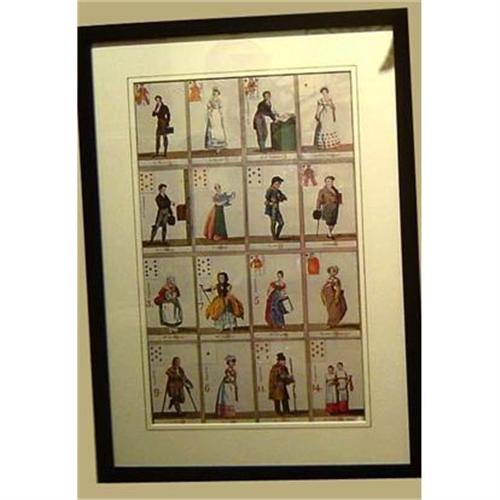19th Century French Hand-Colored Playing Cards With Figures in Period Costumes. Professionally matted and framed. All 16 in excellent condition. Wonderful decoration for the gaming room or den. These cards are extremely hard to find in this condition.