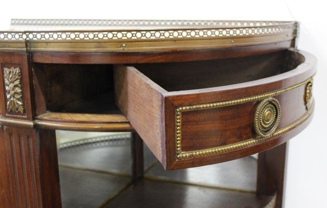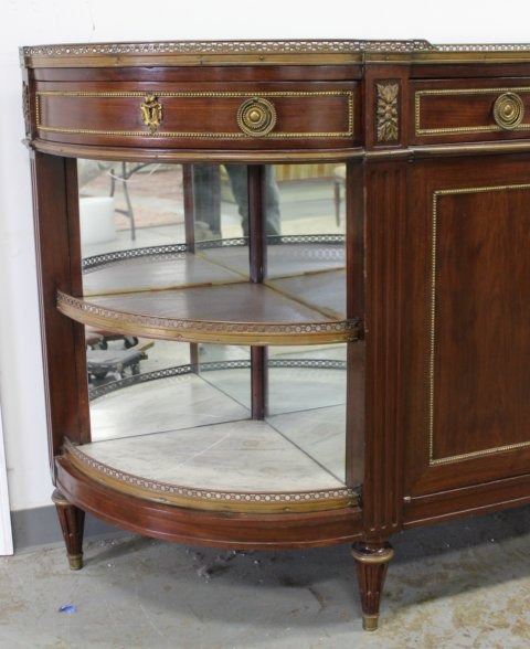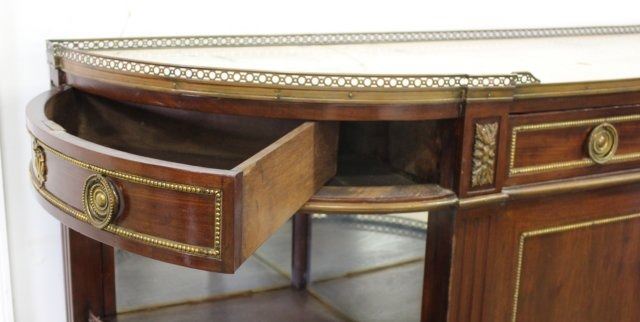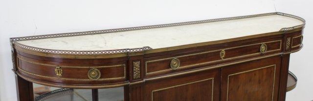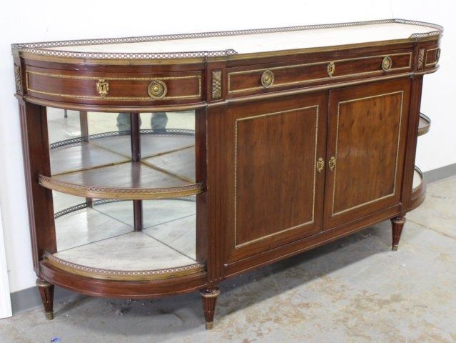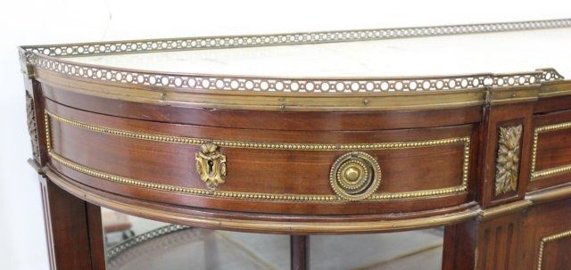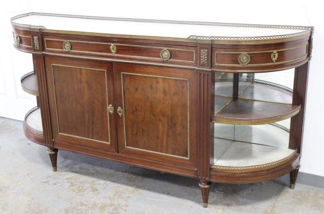 Brass mounted. Gallery on top. Approx. 42 1/2" H x 86 1/4" W x 20 1/2" D. Marble on top repaired. Crack in marble shelf.