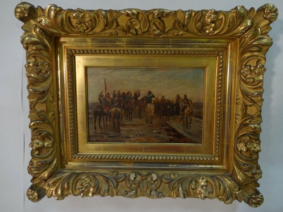 A 19th c. oil on canvas painting of a mounted French army saluting a walking Russian force. Signed lower left hand corner. 6" H x 8 7/8" W. Good condition