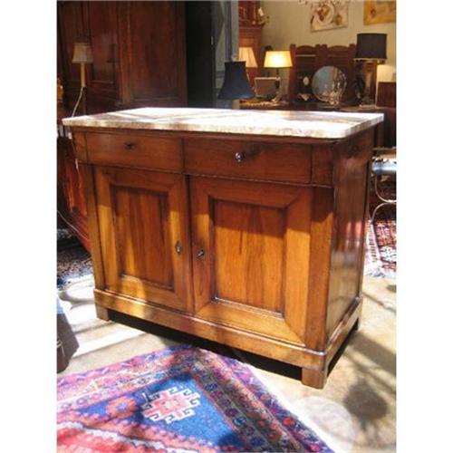 Beautiful French Restoration period buffet in solid blonde walnut with a gold stone marble top from the Rhone Valley, c. 1820. Lovely proportions, wood tone, and extremely unique marble.